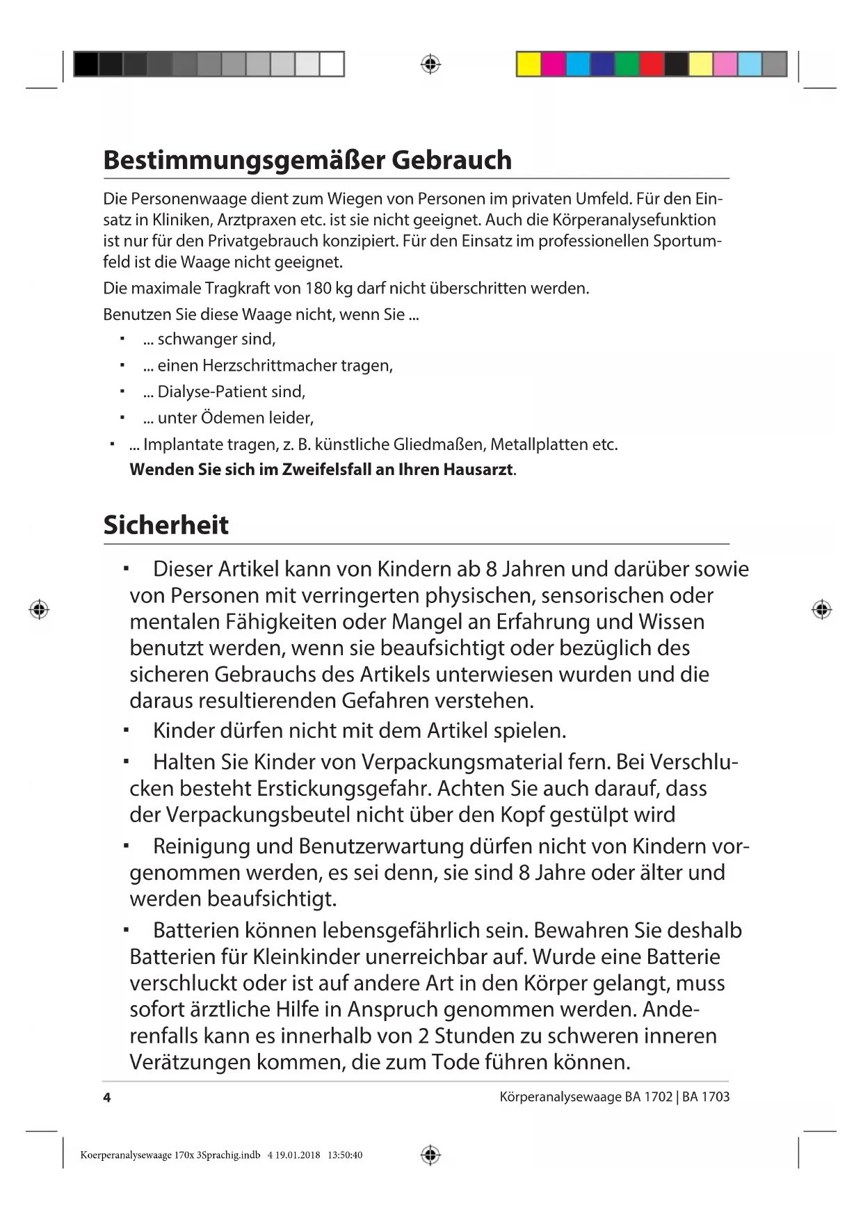 Körperanalysewaage BA 1702 | BA 1703 Bestimmungsgemäßer Gebrauch Die Personenwaage dient zum Wiegen von Personen im privaten Umfeld. Für den Ein- satz in Kliniken, Arztpraxen etc. ist sie nicht geeignet. Auch die Körperanalysefunktion ist nur für den Privatgebrauch konzipiert. Für den Einsatz im professionellen Sportum- feld ist die Waage nicht geeignet. Die maximale Tragkraft von 180 kg darf nicht überschritten werden. Benutzen Sie diese Waage nicht, wenn Sie ... ... schwanger sind, ... einen Herzschrittmacher tragen, ... Dialyse-Patient sind, ... unter Ödemen leider, ... Implantate tragen, z.B. künstliche Gliedmaßen, Metallplatten etc. Wenden Sie sich im Zweifelsfall an Ihren Hausarzt. Sicherheit Dieser Artikel kann von Kindern ab 8 Jahren und darüber sowie von Personen mit verringerten physischen, sensorischen oder mentalen Fähigkeiten oder Mangel an Erfahrung und Wissen benutzt werden, wenn sie beaufsichtigt oder bezüglich des sicheren Gebrauchs des Artikels unterwiesen wurden und die daraus resultierenden Gefahren verstehen. Kinder dürfen nicht mit dem Artikel spielen. Halten Sie Kinder von Verpackungsmaterial fern. Bei Verschlu- cken besteht Erstickungsgefahr. Achten Sie auch darauf, dass der Verpackungsbeutel nicht über den Kopf gestülpt wird Reinigung und Benutzerwartung dürfen nicht von Kindern vor- genommen werden, es sei denn, sie sind 8 Jahre oder älter und werden beaufsichtigt. Batterien können lebensgefährlich sein. Bewahren Sie deshalb Batterien für Kleinkinder unerreichbar auf. Wurde eine Batterie verschluckt oder ist auf andere Art in den Körper gelangt, muss sofort ärztliche Hilfe in Anspruch genommen werden. Ande- renfalls kann es innerhalb von 2Stunden zu schweren inneren Verätzungen kommen, die zum Tode führen können. Koerperanalysewaage 170x 3Sprachig.indb 4 19.01.2018 13:50:40Sicherheit
