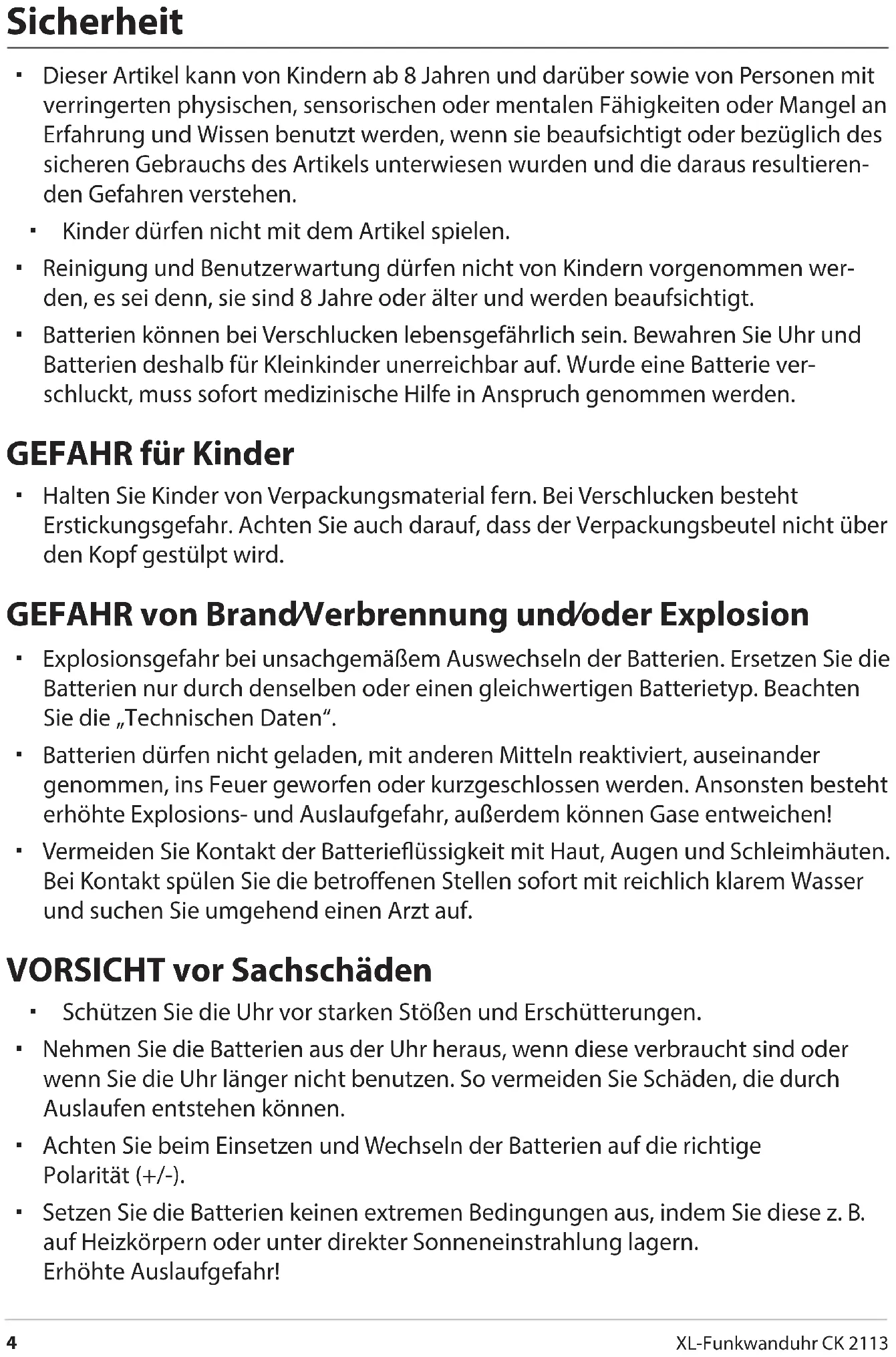 XL-Funkwanduhr CK 2113 Sicherheit Dieser Artikel kann von Kindern ab 8 Jahren und darüber sowie von Personen mit verringerten physischen, sensorischen oder mentalen Fähigkeiten oder Mangel an Erfahrung und Wissen benutzt werden, wenn sie beaufsichtigt oder bezüglich des sicheren Gebrauchs des Artikels unterwiesen wurden und die daraus resultieren- den Gefahren verstehen. Kinder dürfen nicht mit dem Artikel spielen. Reinigung und Benutzerwartung dürfen nicht von Kindern vorgenommen wer- den, es sei denn, sie sind 8 Jahre oder älter und werden beaufsichtigt. Batterien können bei Verschlucken lebensgefährlich sein. Bewahren Sie Uhr und Batterien deshalb für Kleinkinder unerreichbar auf. Wurde eine Batterie ver- schluckt, muss sofort medizinische Hilfe in Anspruch genommen werden. GEFAHR für Kinder Halten Sie Kinder von Verpackungsmaterial fern. Bei Verschlucken besteht Erstickungsgefahr. Achten Sie auch darauf, dass der Verpackungsbeutel nicht über den Kopf gestülpt wird. GEFAHR von Brand/Verbrennung und/oder Explosion Explosionsgefahr bei unsachgemäßem Auswechseln der Batterien. Ersetzen Sie die Batterien nur durch denselben oder einen gleichwertigen Batterietyp. Beachten Sie die „Technischen Daten“. Batterien dürfen nicht geladen, mit anderen Mitteln reaktiviert, auseinander genommen, ins Feuer geworfen oder kurzgeschlossen werden. Ansonsten besteht erhöhte Explosions- und Auslaufgefahr, außerdem können Gase entweichen! Vermeiden Sie Kontakt der Batterieüssigkeit mit Haut, Augen und Schleimhäuten. Bei Kontakt spülen Sie die betroenen Stellen sofort mit reichlich klarem Wasser und suchen Sie umgehend einen Arzt auf. VORSICHT vor Sachschäden Schützen Sie die Uhr vor starken Stößen und Erschütterungen. Nehmen Sie die Batterien aus der Uhr heraus, wenn diese verbraucht sind oder wenn Sie die Uhr länger nicht benutzen. So vermeiden Sie Schäden, die durch Auslaufen entstehen können. Achten Sie beim Einsetzen und Wechseln der Batterien auf die richtige Polarität(+/-). Setzen Sie die Batterien keinen extremen Bedingungen aus, indem Sie diese z. B. auf Heizkörpern oder unter direkter Sonneneinstrahlung lagern. Erhöhte Auslaufgefahr!Bestimmungsgemäßer Gebrauch