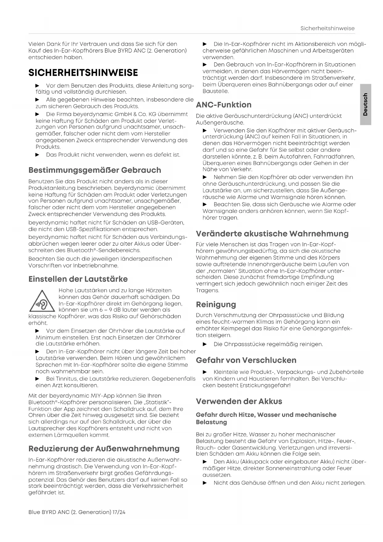 - SOFTWARE DRITTANBIETER Sicherheitshinweise Blue BYRD ANC (2. Generation) 17/24 Vielen Dank für Ihr Verauen und dass Sie sich für den Kauf des In-Ear-Kopfhörers Blue BYRD ANC (2. Generation) entschieden haben. SICHERHEITSHINWEISE ► Vor dem Benutzen des Produkts, diese Anleitung sorg- fältig und volländig durchlesen. ► Alle gegebenen Hinweise beachten, insbesondere die zum sicheren Gebrauch des Produkts. ► Die Firma beyerdynamic GmbH & Co. KG übernimmt keine Haung für Schäden am Produkt oder Verlet- zungen von Personen aufgrund unachtsamer, unsach- gemäßer, falscher oder nicht dem vom Hereller angegebenen Zweck entsprechender Verwendung des Produkts. ► Das Produkt nicht verwenden, wenn es defekt i. Beimmungsgemäßer Gebrauch Benutzen Sie das Produkt nicht anders als in dieser Produktanleitung beschrieben. beyerdynamic übernimmt keine Haung für Schäden am Produkt oder Verletzungen von Personen aufgrund unachtsamer, unsachgemäßer, falscher oder nicht dem vom Hereller angegebenen Zweck entsprechender Verwendung des Produkts. beyerdynamic haet nicht für Schäden an USB-Geräten, die nicht den USB-Spezifikationen entsprechen. beyerdynamic haet nicht für Schäden aus Verbindungs- abbrüchen wegen leerer oder zu alter Akkus oder Über- schreiten des Bluetooth®-Sendebereichs. Beachten Sie auch die jeweiligen länderspezifischen Vorschrien vor Inbetriebnahme. Einellen der Lautärke Hohe Lautärken und zu lange Hörzeiten können das Gehör dauerha schädigen. Da In-Ear-Kopfhörer direkt im Gehörgang liegen, können sie um 6–9dB lauter werden als klassische Kopfhörer, was das Risiko auf Gehörschäden erhöht. ► Vor dem Einsetzen der Ohrhörer die Lautärke auf Minimum einellen. Er nach Einsetzen der Ohrhörer die Lautärke erhöhen. ► Den In-Ear-Kopfhörer nicht über längere Zeit bei hoher Lautärke verwenden. Beim Hören und gewöhnlichem Sprechen mit In-Ear-Kopfhörer sollte die eigene Stimme noch wahrnehmbar sein. ► Bei Tinnitus, die Lautärke reduzieren. Gegebenenfalls einen Arzt konsultieren. Mit der beyerdynamic MIY-App können Sie Ihren Bluetooth®-Kopfhörer personalisieren. Die „Statiik“- Funktion der App zeichnet den Schalldruck auf, dem Ihre Ohren über die Zeit hinweg ausgesetzt sind. Sie bezieht sich allerdings nur auf den Schalldruck, der über die Lautsprecher des Kopfhörers enteht und nicht von externen Lärmquellen kommt. Reduzierung der Außenwahrnehmung In-Ear-Kopfhörer reduzieren die akuische Außenwahr- nehmung draisch. Die Verwendung von In-Ear-Kopf- hörern im Straßenverkehr birgt großes Gefährdungs- potenzial. Das Gehör des Benutzers da auf keinen Fall so ark beeinträchtigt werden, dass die Verkehrssicherheit gefährdet i. ► Die In-Ear-Kopfhörer nicht im Aktionsbereich von mögli- cherweise gefährlichen Maschinen und Arbeitsgeräten verwenden. ► Den Gebrauch von In-Ear-Kopfhörern in Situationen vermeiden, in denen das Hörvermögen nicht beein- trächtigt werden da. Insbesondere im Straßenverkehr, beim Überqueren eines Bahnübergangs oder auf einer Bauelle. ANC-Funktion Die aktive Geräuschunterdrückung (ANC) unterdrückt Außengeräusche. ► Verwenden Sie den Kopfhörer mit aktiver Geräusch- unterdrückung (ANC) auf keinen Fall in Situationen, in denen das Hörvermögen nicht beeinträchtigt werden da und so eine Gefahr für Sie selb oder andere darellen könnte, z. B. beim Autofahren, Fahrradfahren, Überqueren eines Bahnübergangs oder Gehen in der Nähe von Verkehr. ► Nehmen Sie den Kopfhörer ab oder verwenden ihn ohne Geräuschunterdrückung, und passen Sie die Lautärke an, um sicherzuellen, dass Sie Außenge- räusche wie Alarme und Warnsignale hören können. ► Beachten Sie, dass sich Geräusche wie Alarme oder Warnsignale anders anhören können, wenn Sie Kopf- hörer tragen. Verändee akuische Wahrnehmung Für viele Menschen i das Tragen von In-Ear-Kopf- hörern gewöhnungsbedütig, da sich die akuische Wahrnehmung der eigenen Stimme und des Körpers sowie auretende Innenohrgeräusche beim Laufen von der „normalen“ Situation ohne In-Ear-Kopfhörer unter- scheiden. Diese zunäch fremdaige Empfindung verringe sich jedoch gewöhnlich nach einiger Zeit des Tragens. Reinigung Durch Verschmutzung der Ohrpassücke und Bildung eines feucht-warmen Klimas im Gehörgang kann ein erhöhter Keimpegel das Risiko für eine Gehörgangsinfek- tion eigern. ► Die Ohrpassücke regelmäßig reinigen. Gefahr von Verschlucken ► Kleinteile wie Produkt-, Verpackungs- und Zubehöeile von Kindern und Hauieren fernhalten. Bei Verschlu- cken beeht Erickungsgefahr! Verwenden der Akkus Gefahr durch Hitze, Wasser und mechanische Belaung Bei zu großer Hitze, Wasser zu hoher mechanischer Belaung beeht die Gefahr von Explosion, Hitze-, Feuer-, Rauch- oder Gasentwicklung. Verletzungen und irreversi- blen Schäden am Akku können die Folge sein. ► Den Akku (Akkupack oder eingebauter Akku) nicht über- mäßiger Hitze, direkter Sonneneinrahlung oder Feuer aussetzen. ► Nicht das Gehäuse önen und den Akku nicht zerlegen. DeutschZu dieser Anleitung 18/24 Blue BYRD ANC (2. Generation) ► Den Akku nicht verwenden, falls er in Kontakt mit Wasser gekommen sein könnte. ► Zum Lades des Akkus über die integriee USB-Buchse TypC nur ein USB2.0/3.0 andardkonformes 5V-Netz- teil verwenden (Stromaufnahme beträgt max. 0,5A). Lagerung des Akkus ► Wenn der Akku längere Zeit nicht verwendet bzw. gela- ge wird: Akku auf ungefähr 50% der Ladung bringen und bei Temperaturen bis max. 30°C lagern. Umweltbedingungen ► Das Produkt weder Regen noch Schnee, Flüssigkeiten oder Feuchtigkeit aussetzen. p. 23