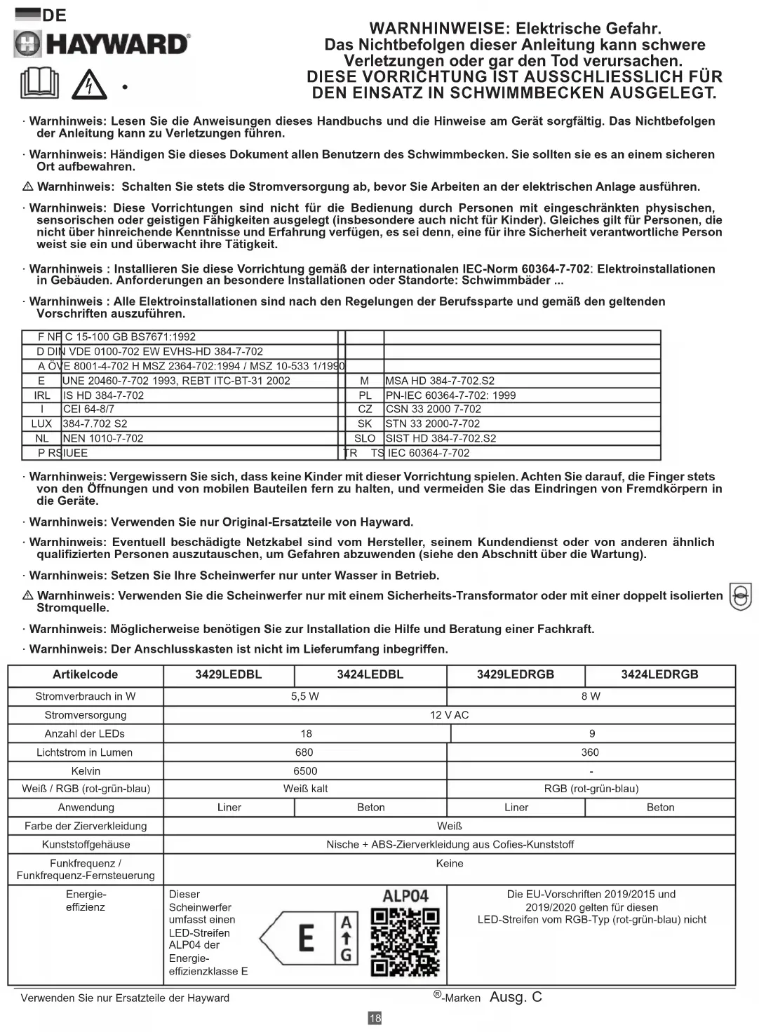 DEN EINSATZ IN SCHWIMMBECKEN AUSGELEGT. c • Artikelcode 3429LEDBL 3424LEDBL 3429LEDRGB 3424LEDRGB Stromverbrauch in W 5,5 W 8 WStromversorgung 12 V ACAnzahl der LEDs 18 9Lichtstrom in Lumen 680 360Kelvin 6500 -Weiß / RGB (rot-grün-blau) Weiß kalt RGB (rot-grün-blau) Anwendung Liner Beton Liner Beton Farbe der Zierverkleidung WeißKunststogehäuse Nische + ABS-Zierverkleidung aus Coes-KunststoFunkfrequenz / Funkfrequenz-FernsteuerungKeineEnergie-ezienzDieser Scheinwerfer umfasst einen LED-Streifen ALP04 der Energie- ezienzklasse EDie EU-Vorschriften 2019/2015 und 2019/2020 gelten für diesen LED-Streifen vom RGB-Typ (rot-grün-blau) nicht19