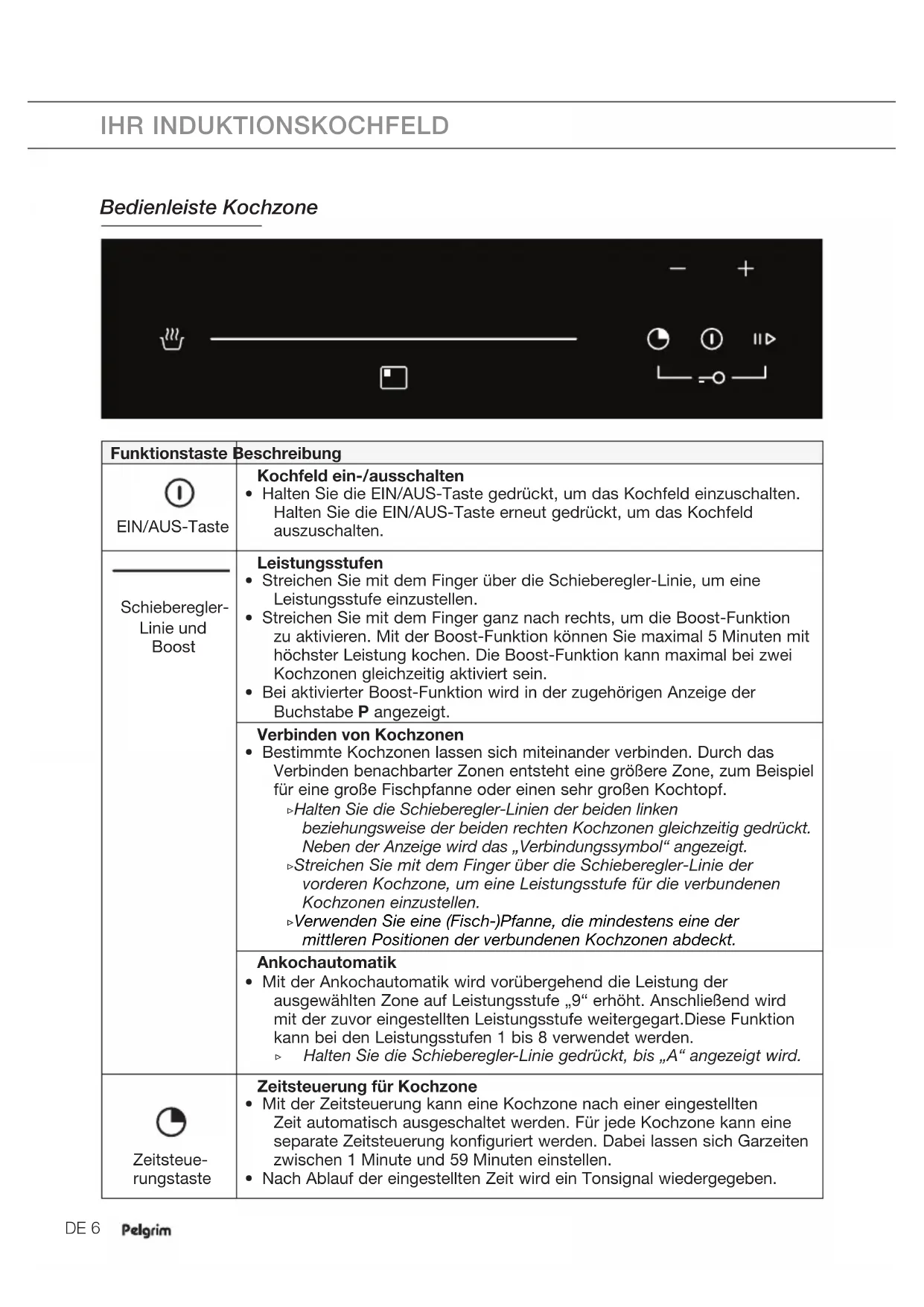 IHR INDUKTIONSKOCHFELDDE 6 IHR INDUKTIONSKOCHFELD Bedienleiste Kochzone Funktionstaste Beschreibung EIN/AUS-Taste Kochfeld ein-/ausschalten