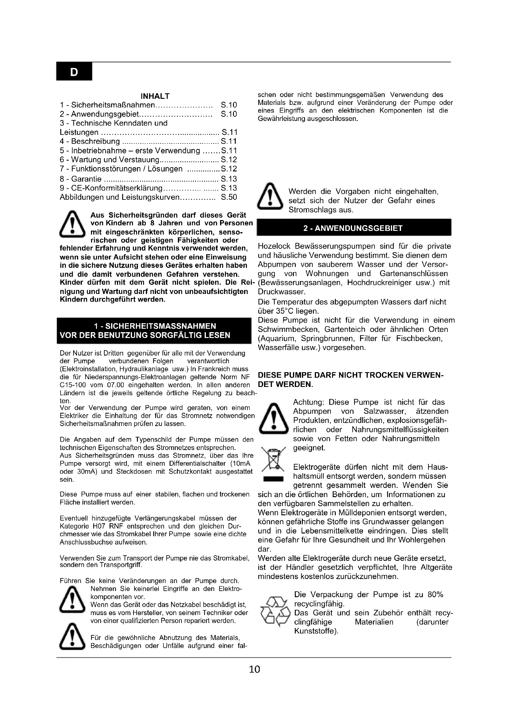 DET WERDEN. Achtung: Diese Pumpe ist nicht für das Abpumpen von Salzwasser, ätzenden Produkten, entzündlichen, explosionsgefäh- rlichen oder Nahrungsmittelflüssigkeiten sowie von Fetten oder Nahrungsmitteln geeignet. Elektrogeräte dürfen nicht mit dem Haus- haltsmüll entsorgt werden, sondern müssen getrennt gesammelt werden. Wenden Sie sich an die örtlichen Behörden, um Informationen zu den verfügbaren Sammelstellen zu erhalten. Wenn Elektrogeräte in Mülldeponien entsorgt werden, können gefährliche Stoffe ins Grundwasser gelangen und in die Lebensmittelkette eindringen. Dies stellt eine Gefahr für Ihre Gesundheit und Ihr Wohlergehen dar. Werden alte Elektrogeräte durch neue Geräte ersetzt, ist der Händler gesetzlich verpflichtet, Ihre Altgeräte mindestens kostenlos zurückzunehmen. Die Verpackung der Pumpe ist zu 80% recyclingfähig. Das Gerät und sein Zubehör enthält recy- clingfähige Materialien (darunter Kunststoffe).11
