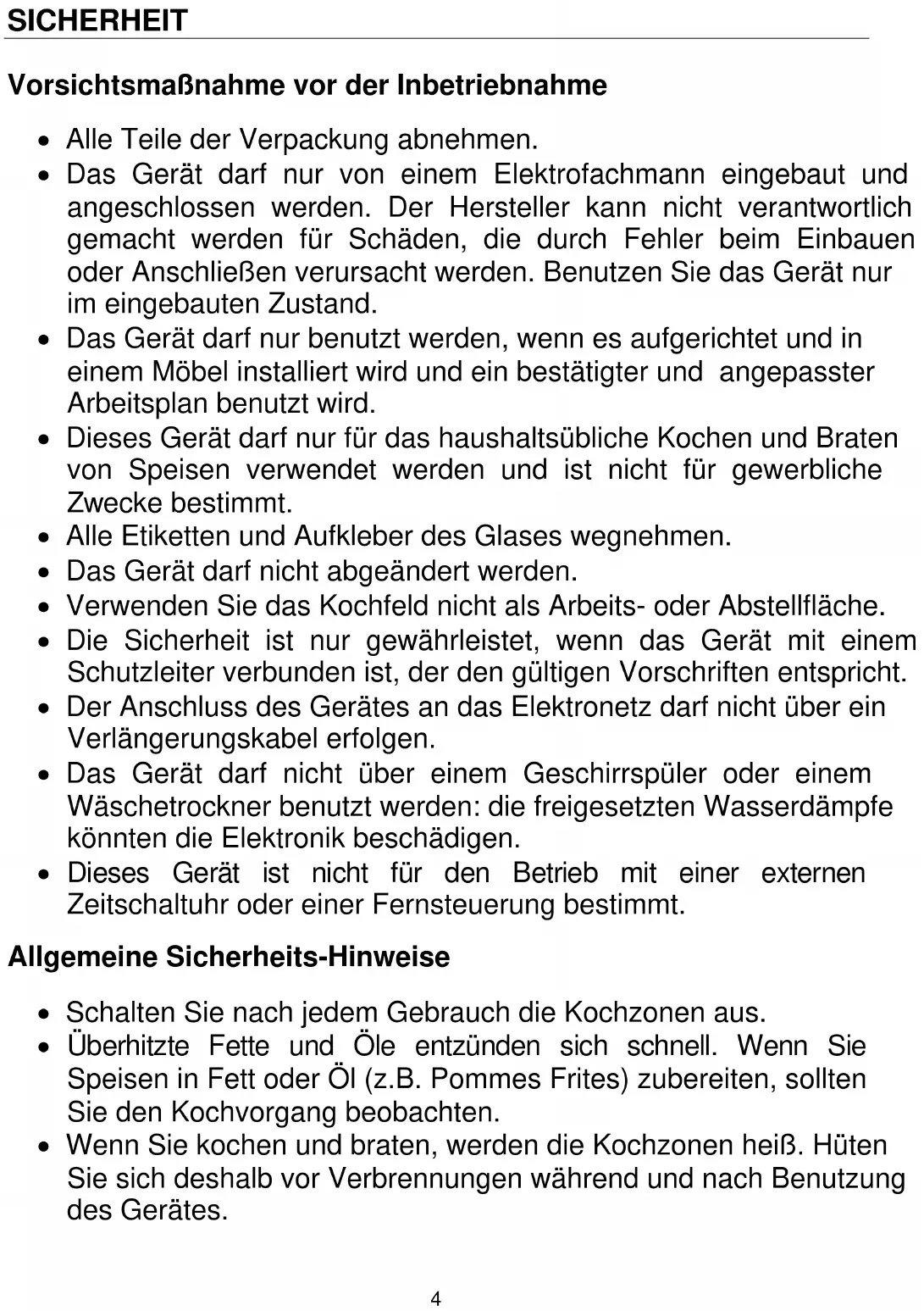 - WARNUNG: Wenn die Glasoberfläche gesprungen ist, ist das Gerät auszuschalten um die Gefahr eines elektrischen Schlages zu vermeiden. Schutz vor weiteren Gefahren