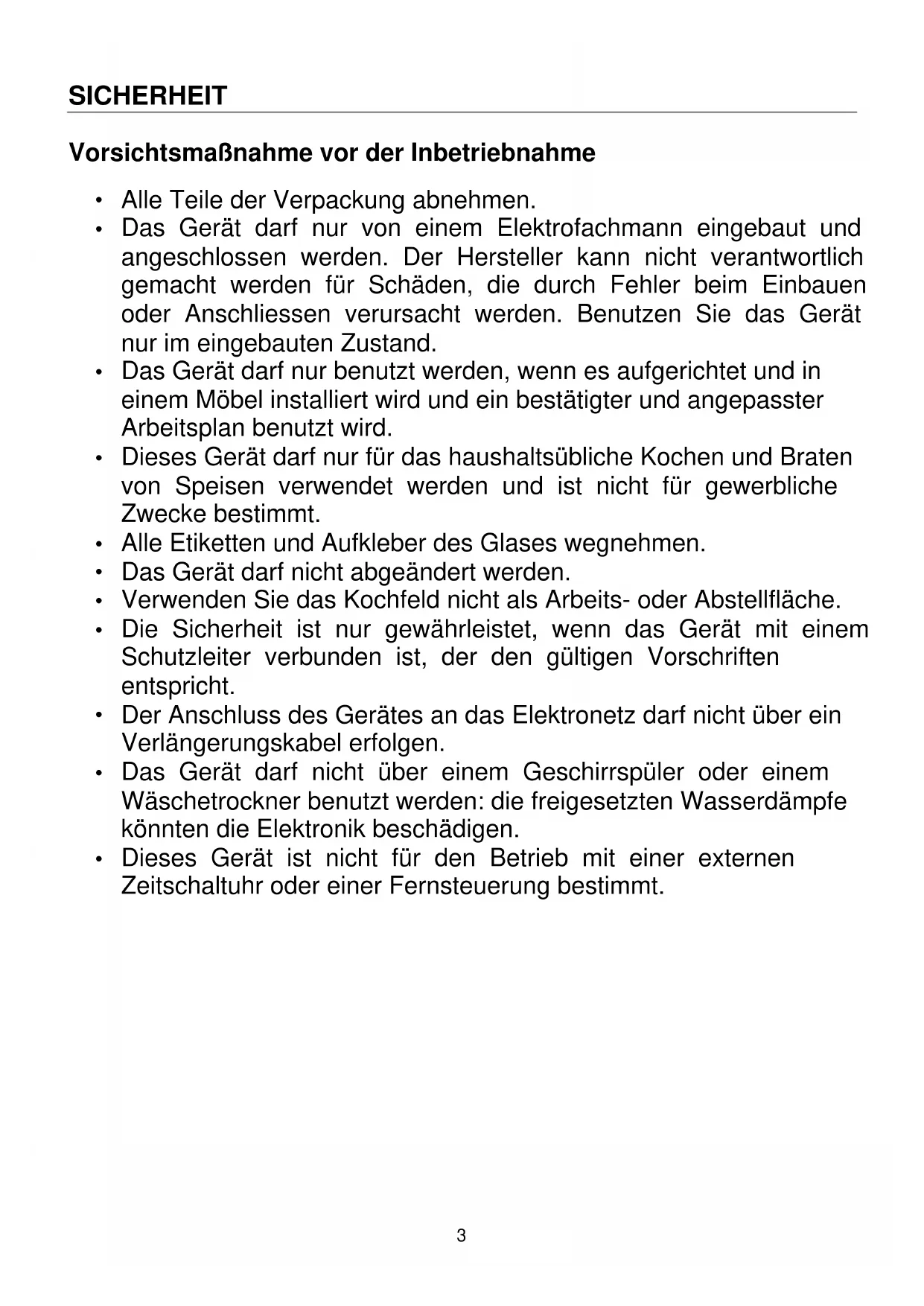 Das Gerät darf nur von einem Elektrofachmann eingebaut und angeschlossen werden. Der Hersteller kann nicht verantwortlich gemacht werden für Schäden, die durch Fehler beim Einbauen oder Anschliessen verursacht werden. Benutzen Sie das Gerät nur im eingebauten Zustand.