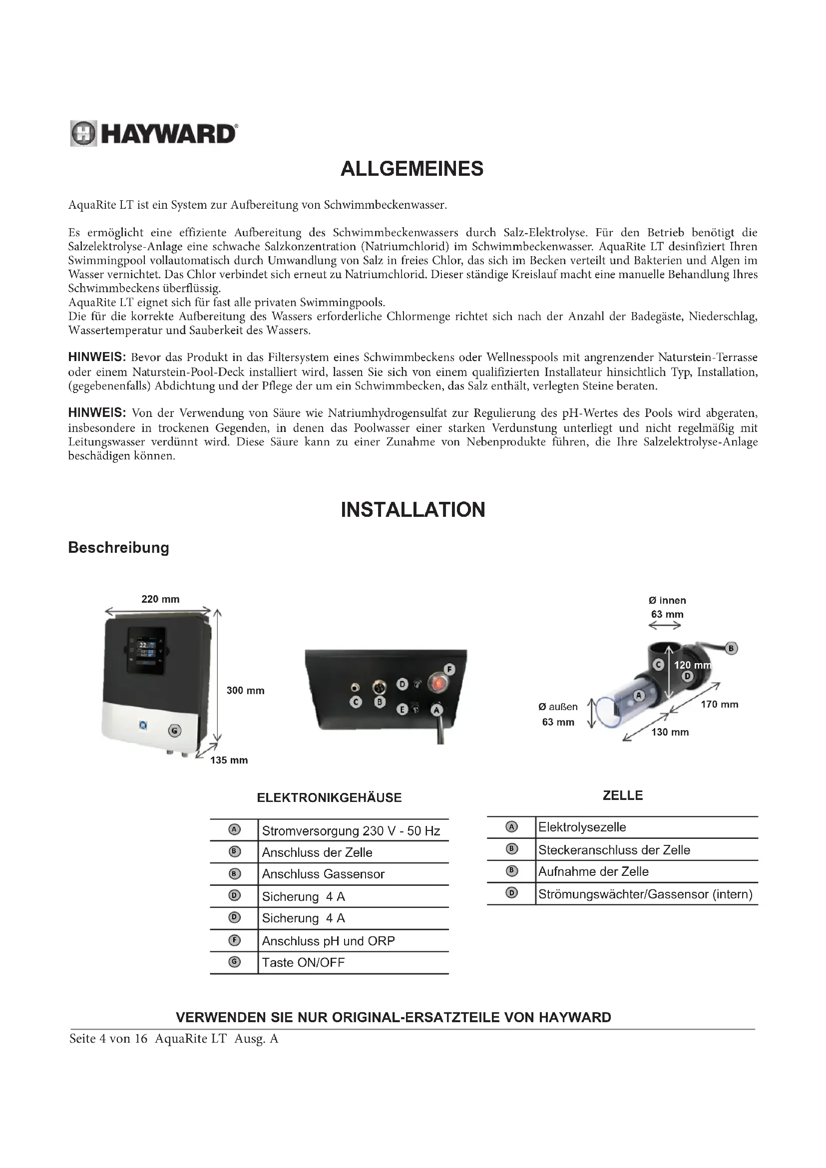 BEDIENUNGSANLEITUNG AquaRite LT SV HAYWARD