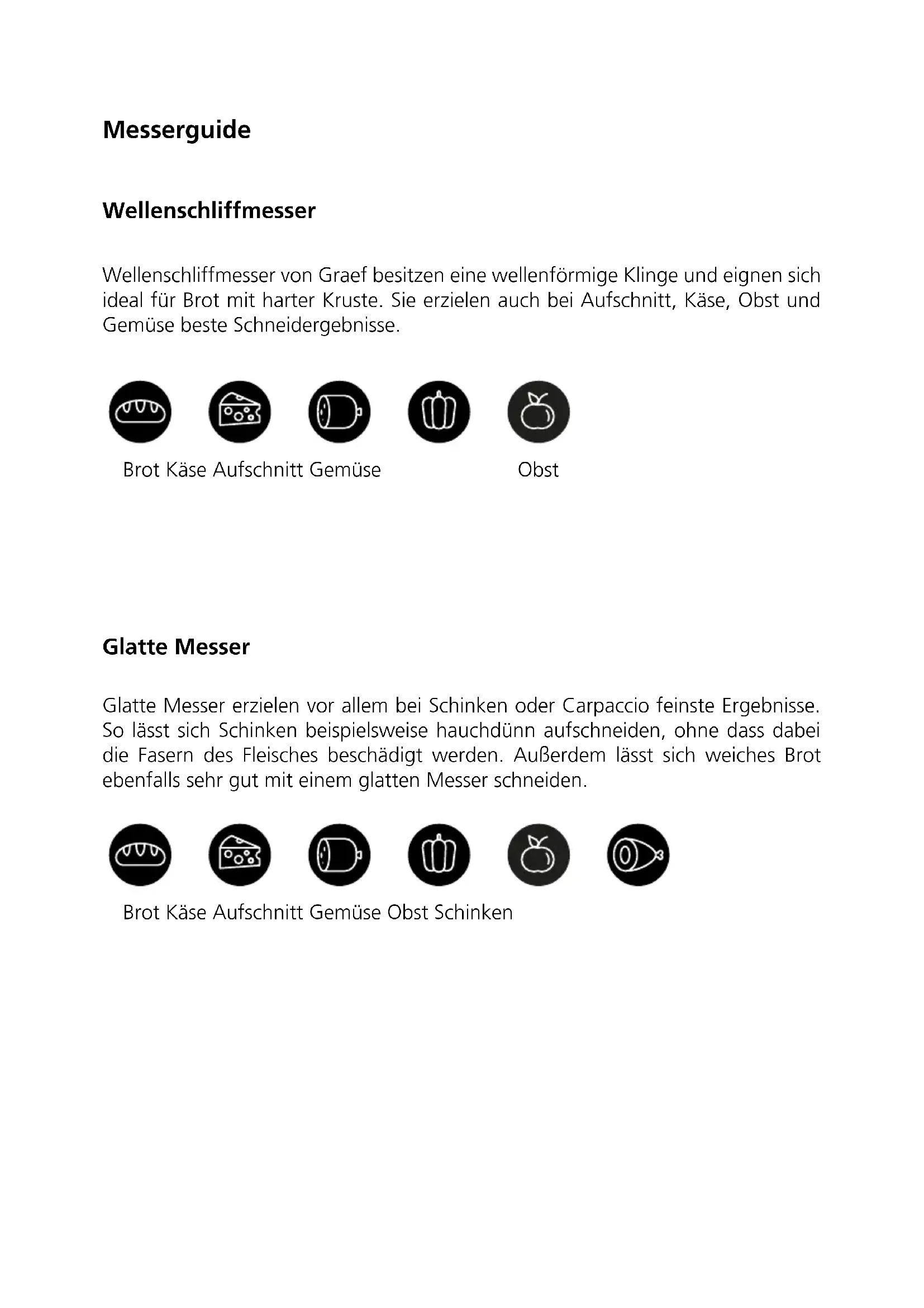 Brugsvejledning BrødmaskineMesserguide Wellenschliffmesser Wellenschliffmesser von Graef besitzen eine wellenförmige Klinge und eignen sich ideal für Brot mit harter Kruste. Sie erzielen auch bei Aufschnitt, Käse, Obst und Gemüse beste Schneidergebnisse. Brot Käse Aufschnitt Gemüse Glatte Messer Glatte Messer erzielen vor allem bei Schinken oder Carpaccio feinste Ergebnisse. So lässt sich Schinken beispielsweise hauchdünn aufschneiden, ohne dass dabei die Fasern des Fleisches beschädigt werden. Außerdem lässt sich weiches Brot ebenfalls sehr gut mit einem glatten Messer schneiden. Obst Brot Käse Aufschnitt Gemüse Obst SchinkenA