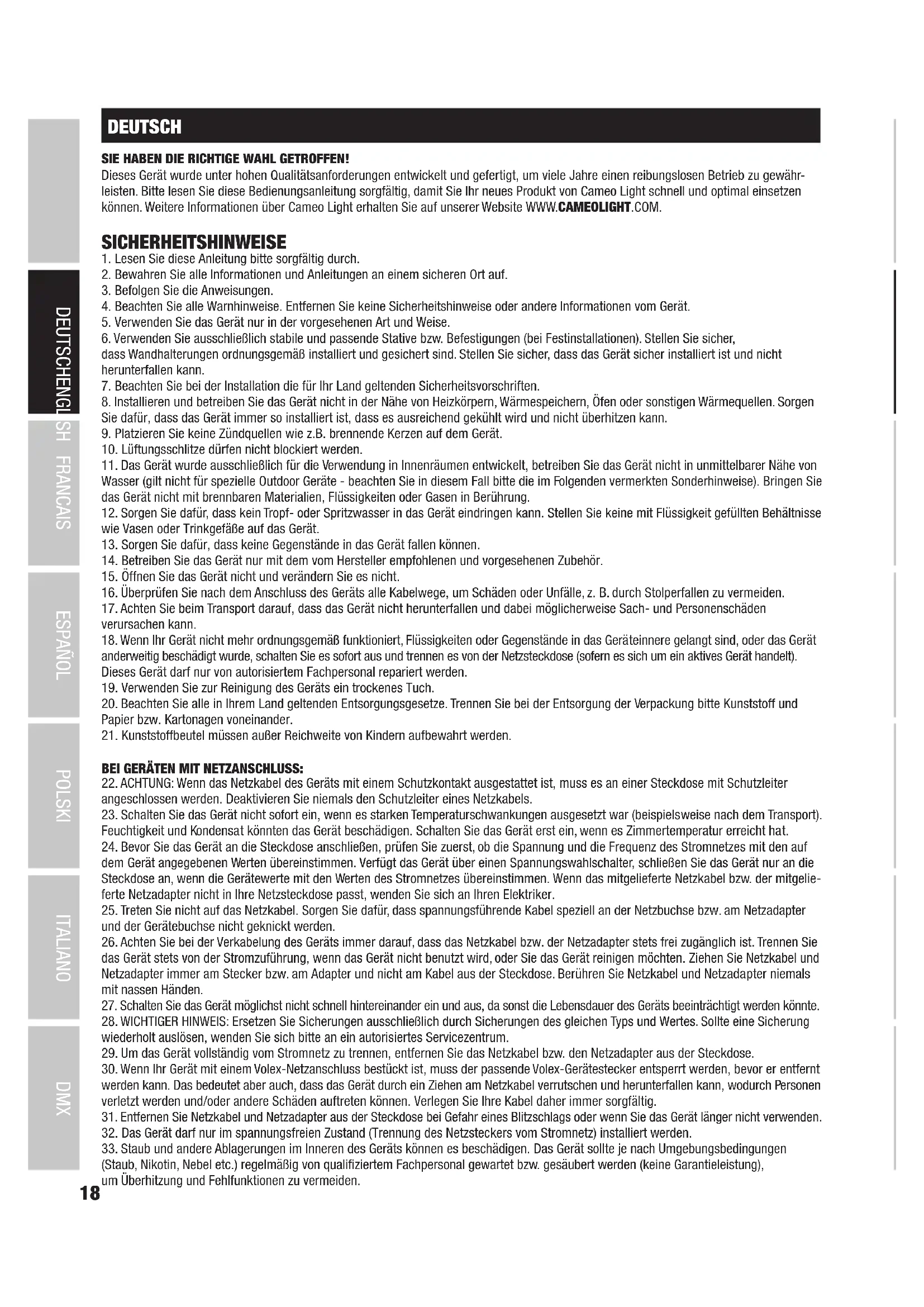 (Gültig in der Europäischen Union und anderen europäischen Ländern mit Mülltrennung) Dieses Symbol auf dem Produkt oder dazugehörigen Dokumenten weist darauf hin, dass das Gerät am Ende der Produktlebenszeit nicht zusammen mit dem normalen Hausmüll entsorgt werden darf, um Umwelt- oder Personenschäden durch unkontrollierte Abfallentsorgung zu vermeiden. Bitte entsorgen Sie dieses Produkt getrennt von anderen Abfällen und führen es zur Förderung nachhaltiger Wirtschaftskreisläufe dem Recycling zu. Als Privatkunde erhalten Sie Informationen zu umweltfreundlichen Entsorgungsmöglichkeiten über den Händler, bei dem das Produkt erworben wurde, oder über die entsprechenden regionalen Behörden. Als gewerblicher Nutzer kontaktieren Sie bitte Ihren Lieferanten und prüfen die ggf. vertraglich vereinbarten Konditionen zur Entsorgung der Geräte. Dieses Produkt darf nicht zusammen mit anderen gewerblichen Abfällen entsorgt werden. CE-Konformität Hiermit erklärt die Adam Hall GmbH, dass dieses Produkt folgenden Richtlinien entspricht (soweit zutreffend): R&TTE (1999/5/EG) bzw. RED (2014/53/EU) ab Juni 2017 Niederspannungsrichtlinie (2014/35/EU) EMV-Richtlinie (2014/30/EU) RoHS (2011/65/EU) Die vollständige Konformitätserklärung finden Sie unter www.adamhall.com. Des Weiteren können Sie diese auch unter info@adamhall.com anfragen.35 DMX DEUTSCHFRANCAIS ESPAÑOL ENGLISH ITALIANO POLSKI FRANCAIS Vous avez fait le bon choix! Cet appareil a été développé et fabriqué en appliquant des exigences de qualité très élevées: il garantit des années de fonctionnement sans problème.Veuillez lire attentivement ce Manuel Utilisateur : vous apprendrez rapidement à utiliser votre appareil Cameo Light de façon optimale. Vous trouverez davantage d‘informations à propos de Cameo Light sur notre site Web: WWW.CAMEOLIGHT.COM.