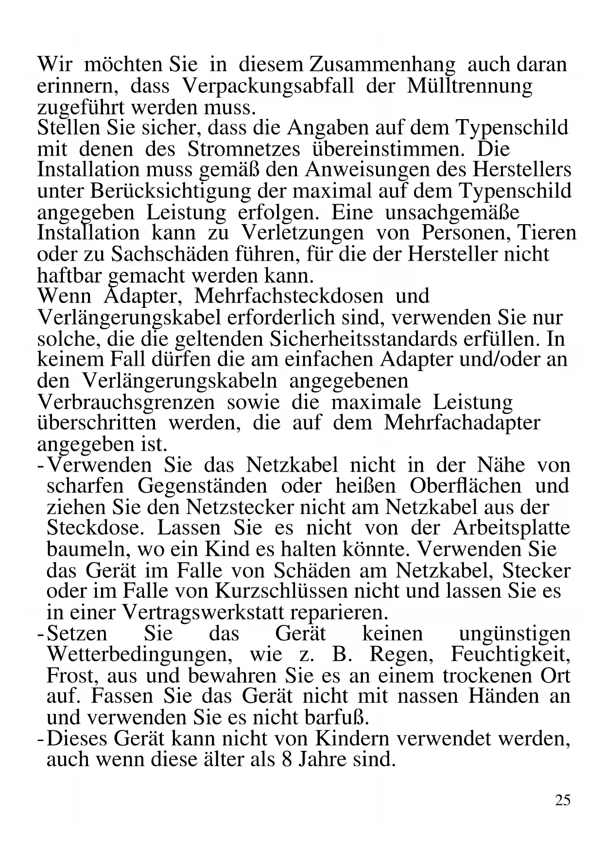 DEUTSCH: HINWEISE: Verwenden Sie das Gerät nur nach den Anweisungen in dieser Bedienungsanleitung. Jede anderweitige Verwendung gilt als unsachgemäß und gefährlich, und der Hersteller kann für Schäden nicht haftbar gemacht werden, die durch eine unsachgemäße, falsche oder unvernünftige Verwendung verursacht werden. Stellen Sie vor der Verwendung sicher, dass das Gerät unversehrt ist. Im Zweifelsfall verwenden Sie es nicht und wenden Sie sich an den Kundendienst. Verpackungsmaterial (Plastiktüten, Styropor, Nägel, Klammern) muss für Kinder unzugänglich aufbewahrt werden, da es eine potenzielle Gefahrenquelle darstellt.25 Wir möchten Sie in diesem Zusammenhang auch daran erinnern, dass Verpackungsabfall der Mülltrennung zugeführt werden muss. Stellen Sie sicher, dass die Angaben auf dem Typenschild mit denen des Stromnetzes übereinstimmen. Die Installation muss gemäß den Anweisungen des Herstellers unter Berücksichtigung der maximal auf dem Typenschild angegeben Leistung erfolgen. Eine unsachgemäße Installation kann zu Verletzungen von Personen, Tieren oder zu Sachschäden führen, für die der Hersteller nicht haftbar gemacht werden kann. Wenn Adapter, Mehrfachsteckdosen und Verlängerungskabel erforderlich sind, verwenden Sie nur solche, die die geltenden Sicherheitsstandards erfüllen. In keinem Fall dürfen die am einfachen Adapter und/oder an den Verlängerungskabeln angegebenen Verbrauchsgrenzen sowie die maximale Leistung überschritten werden, die auf dem Mehrfachadapter angegeben ist. - Verwenden Sie das Netzkabel nicht in der Nähe von scharfen Gegenständen oder heißen Oberflächen und ziehen Sie den Netzstecker nicht am Netzkabel aus der Steckdose. Lassen Sie es nicht von der Arbeitsplatte baumeln, wo ein Kind es halten könnte. Verwenden Sie das Gerät im Falle von Schäden am Netzkabel, Stecker oder im Falle von Kurzschlüssen nicht und lassen Sie es in einer Vertragswerkstatt reparieren. - Setzen Sie das Gerät keinen ungünstigen Wetterbedingungen, wie z. B. Regen, Feuchtigkeit, Frost, aus und bewahren Sie es an einem trockenen Ort auf. Fassen Sie das Gerät nicht mit nassen Händen an und verwenden Sie es nicht barfuß. - Dieses Gerät kann nicht von Kindern verwendet werden, auch wenn diese älter als 8 Jahre sind.26 - Dieses Gerät kann von Personen mit eingeschränkten körperlichen, sensorischen oder geistigen Fähigkeiten oder mangelnder Erfahrung und Kenntnissen verwendet werden, wenn sie in sicherer Weise beaufsichtigt oder instruiert wurden, wie das Gerät verwendet werden kann, und die damit verbundenen Gefahren verstehen. - Bewahren Sie das Gerät und sein Netzanschluss außerhalb der Reichweite von Kinder unter 8 Jahren. - Kinder dürfen nicht mit dem Gerät spielen. Wenn das Netzkabel beschädigt ist oder wenn ein Fehler vorliegt, darf das Gerät nicht manipuliert werden. Jede Reparatur muss vom Hersteller oder seinem technischen Kundendienst oder in jedem Fall von einer Person mit ähnlicher Qualifikation durchgeführt werden, um jegliches Risiko zu vermeiden. Die Nichtbeachtung der vorstehenden Bestimmungen kann die Sicherheit des Geräts beeinträchtigen und die Garantiebedingungen ungültig machen. Dieses Gerät ist nur für den Hausgebrauch oder gleichwertiges bestimmt, in Situationen wie bspw.: Kantinen in kleinen Firmen oder ähnliche Arbeitsumgebungen, von Kunden in Hotels, Motels oder andere Art von touristische Unterkunft, wie ländlicher oder Wohn –Tourismus. Das Gerät darf nicht mit einer Zeitschaltuhr oder mit einem separaten Fernwirksystem betrieben werden Führen Sie vor jedem Gebrauch das Netzkabel aus. Setzen Sie das Produkt keinen Stößen aus, es könnte beschädigt werden. Verwenden Sie nur originale und kompatible Teile und Zubehör. ALLGEMEINE ANWEISUNGEN Reinigen Sie vor dem ersten Gebrauch sorgfältig alle Teile, die mit Lebensmitteln in Berührung kommen, wie den Behälter, das Glas, den Deckel, die Filtern und dem27 Mixer. ACHTUNG: Sorgen Sie vor der ersten Inbetriebnahme des Geräts für eine korrekte Installation. Ziehen Sie den Netzstecker aus der Steckdose. Bringen Sie den Knopf auf "0" (OFF), bevor Sie den Stecker in die Steckdose stecken. Es ist ratsam, Lebensmittel vorzuschneiden, um eine bessere Zentrifugation durchzuführen. Legen Sie keine großen Stücke in die Kammer, besonders keine harten Lebensmittel. Es ist ratsam, die Lebensmittel vorzuschneiden. Wenn Sie mit Früchten arbeiten, entfernen Sie zuerst den Kern. Geben Sie das Essen nur mit dem passenden Lebensmittelpresser ein. Halten Sie, während das Gerät eingeschaltet ist, keine Finger oder Gegenstände in die Lebensmittelöffnung ein. Setzen Sie während des Gebrauchs bei installiertem Deckel-Schaumfilter stets den Ausguss auf die Tasse. Wenn das Gerät nicht korrekt montiert ist, verhindert eine Sicherheitseinrichtung den Betrieb. Sollte sich das Produkt nicht einschalten, überprüfen Sie, ob es richtig installiert ist. Entleeren Sie nach jedem Gebrauch den Abfallbehälter. Benutzen Sie das Gerät nicht länger als 15 Minuten und legen Sie mindestens eine Pause von 5 Minuten ein. Füllen Sie keine zu heißen Lebensmittel ein (maximale Temperatur 60° C). Füllen Sie kein heißes Wasser ein. Tauchen Sie das Produkt und/oder sein Zubehör nicht in kochendes Wasser ein. Lassen Sie die Anwendung während der Benutzung niemals unbeaufsichtigt. Ziehen Sie das Netzkabel sofort nach dem Gebrauch und/oder vor dem Anschluss von Zubehörteilen aus der28 Steckdose. Schalten Sie das Produkt sofort aus, wenn irgendwelche Lebensmittel auf dem Filter oder auf der Schnecke stecken bleiben. Versuchen Sie es zu deaktivieren, indem Sie die REVERSE-Taste für 5 Sekunden drücken, um die Rückwärtsdrehung zu aktivieren und schalten Sie dann den Extraktor wieder ein. Sobald Sie mit der Benutzung des Geräts fertig sind, empfiehlt es sich, das Netzkabel zu wickeln, um eine bessere Reinigung zu gewährleisten und das Risiko einer Beschädigung zu vermeiden. Zur