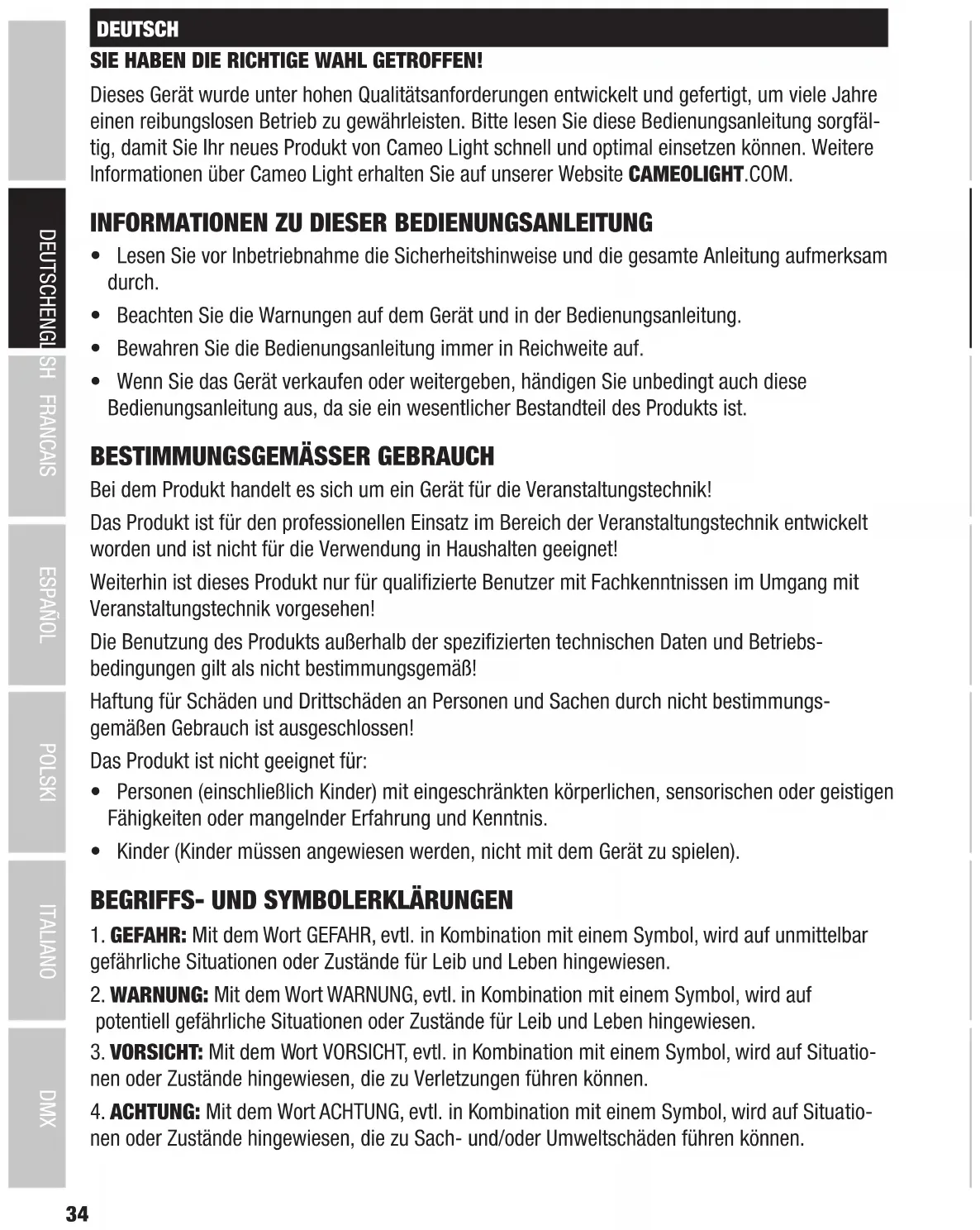Products that are subject to Electrical Equipment(Safety)Regulation 2016, EMC Regulation 2016 or RoHS Regulation can be requested at info@adamhall.com. Products that are subject to the Radio Equipments Regulations 2017 (SI2017/1206) can be down- loaded from www.adamhall.com/compliance/ SUBJECT TO MISPRINTS AND ERRORS, AS WELL AS TECHNICAL OR OTHER MODIFICATIONS!34 DMX ITALIANO POLSKI ESPAÑOL FRANCAIS DEUTSCHENGLISH DEUTSCH SIE HABEN DIE RICHTIGE WAHL GETROFFEN! Dieses Gerät wurde unter hohen Qualitätsanforderungen entwickelt und gefertigt, um viele Jahre einen reibungslosen Betrieb zu gewährleisten. Bitte lesen Sie diese Bedienungsanleitung sorgfäl- tig, damit Sie Ihr neues Produkt von Cameo Light schnell und optimal einsetzen können. Weitere Informationen über Cameo Light erhalten Sie auf unserer Website CAMEOLIGHT.COM.