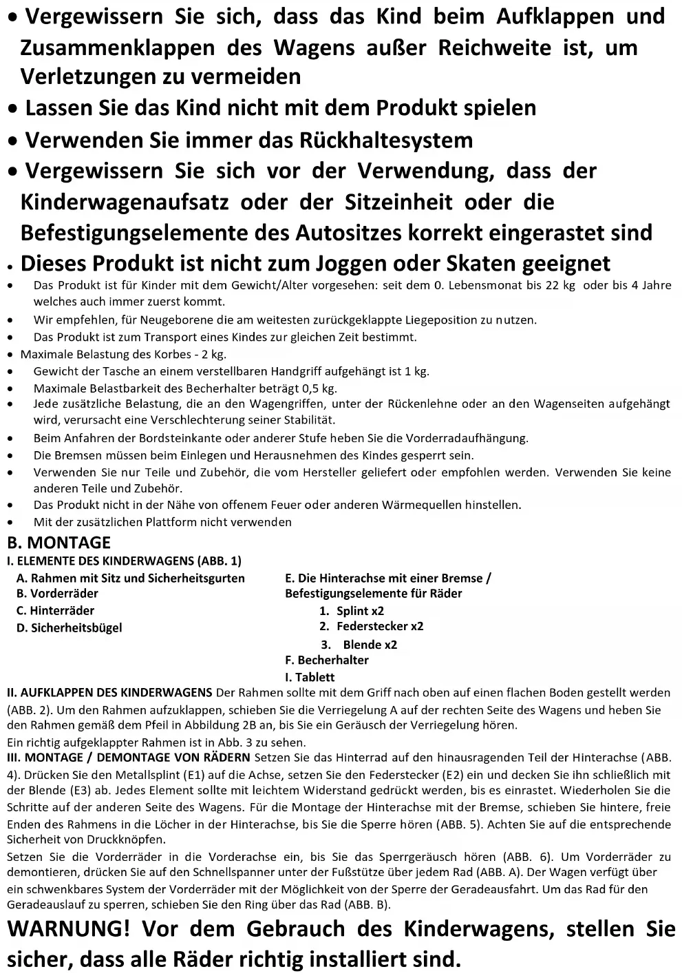 - Vergewissern Sie sich vor Gebrauch, dass alle Verriegelungen eingerastet sind• Vergewissern Sie sich, dass das Kind beim Aufklappen und Zusammenklappen des Wagens außer Reichweite ist, um Verletzungen zu vermeiden