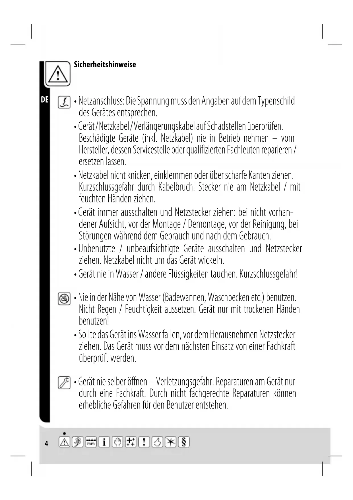 - Sollte das Gerät ins Wasser fallen, vor dem Herausnehmen Netzstecker ziehen. Das Gerät muss vor dem nächsten Einsatz von einer Fachkraft überprüft werden.