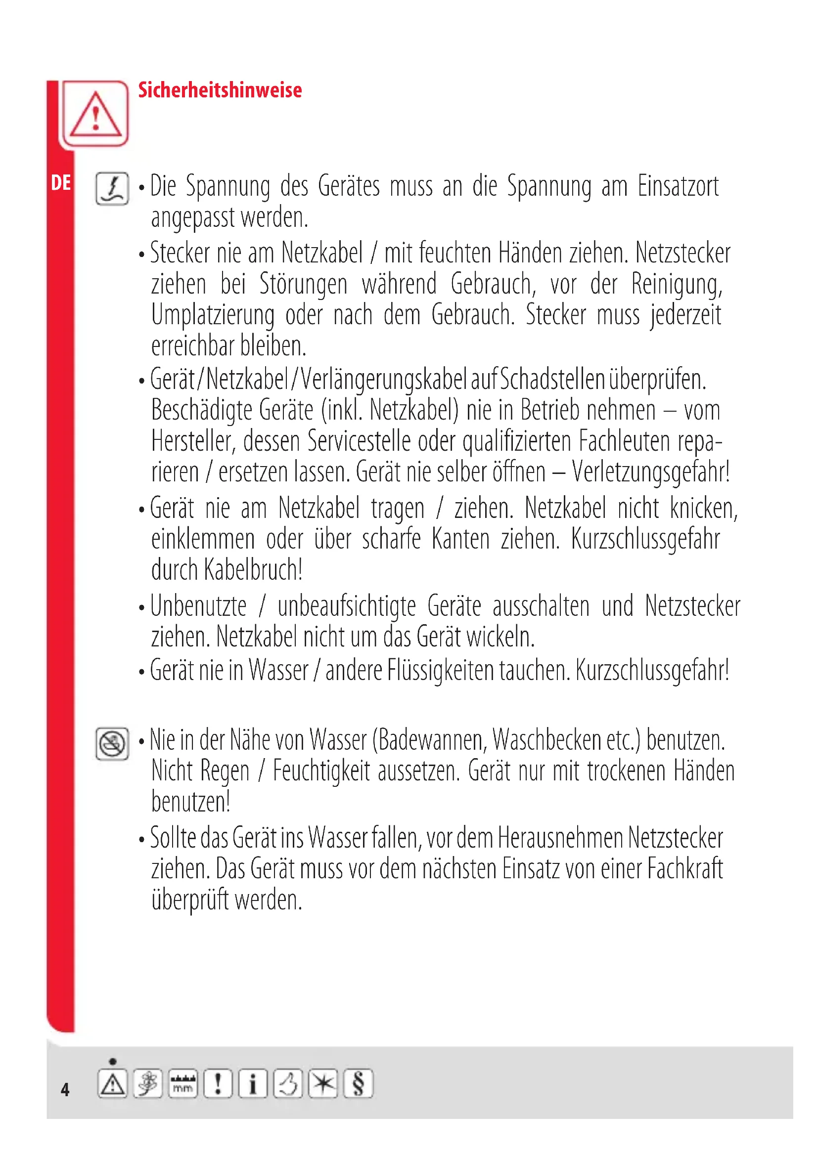 - Nie in der Nähe von Wasser (Badewannen, Waschbecken etc.) benutzen. Nicht Regen / Feuchtigkeit aussetzen. Gerät nur mit trockenen Händen benutzen!5 Sicherheitshinweise