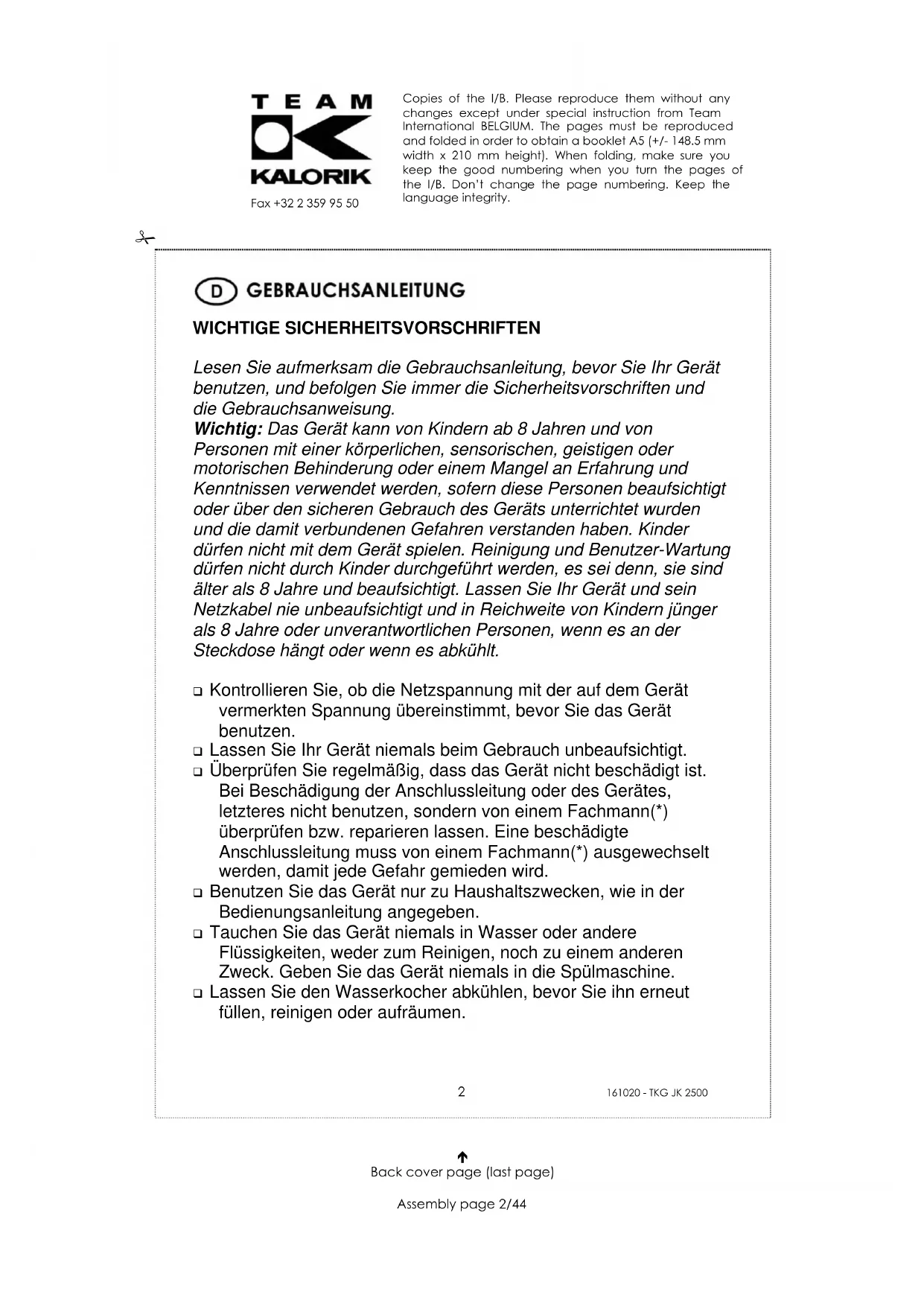 WICHTIGE SICHERHEITSVORSCHRIFTEN Lesen Sie aufmerksam die Gebrauchsanleitung, bevor Sie Ihr Gerät benutzen, und befolgen Sie immer die Sicherheitsvorschriften und die Gebrauchsanweisung. Wichtig: Das Gerät kann von Kindern ab 8 Jahren und von Personen mit einer körperlichen, sensorischen, geistigen oder motorischen Behinderung oder einem Mangel an Erfahrung und Kenntnissen verwendet werden, sofern diese Personen beaufsichtigt oder über den sicheren Gebrauch des Geräts unterrichtet wurden und die damit verbundenen Gefahren verstanden haben. Kinder dürfen nicht mit dem Gerät spielen. Reinigung und Benutzer-Wartung dürfen nicht durch Kinder durchgeführt werden, es sei denn, sie sind älter als 8 Jahre und beaufsichtigt. Lassen Sie Ihr Gerät und sein Netzkabel nie unbeaufsichtigt und in Reichweite von Kindern jünger als 8 Jahre oder unverantwortlichen Personen, wenn es an der Steckdose hängt oder wenn es abkühlt. Kontrollieren Sie, ob die Netzspannung mit der auf dem Gerät vermerkten Spannung übereinstimmt, bevor Sie das Gerät benutzen. Lassen Sie Ihr Gerät niemals beim Gebrauch unbeaufsichtigt. Überprüfen Sie regelmäßig, dass das Gerät nicht beschädigt ist. Bei Beschädigung der Anschlussleitung oder des Gerätes, letzteres nicht benutzen, sondern von einem Fachmann(*) überprüfen bzw. reparieren lassen. Eine beschädigte Anschlussleitung muss von einem Fachmann(*) ausgewechselt werden, damit jede Gefahr gemieden wird. Benutzen Sie das Gerät nur zu Haushaltszwecken, wie in der Bedienungsanleitung angegeben. Tauchen Sie das Gerät niemals in Wasser oder andere Flüssigkeiten, weder zum Reinigen, noch zu einem anderen Zweck. Geben Sie das Gerät niemals in die Spülmaschine. Lassen Sie den Wasserkocher abkühlen, bevor Sie ihn erneut füllen, reinigen oder aufräumen. Copies of the I/B. Please reproduce them without any changes except under special instruction from Team International BELGIUM. The pages must be reproduced and folded in order to obtain a booklet A5 (+/- 148.5 mm width x 210 mm height). When folding, make sure you keep the good numbering when you turn the pages of the I/B. Don’t change the page numbering. Keep the language integrity.