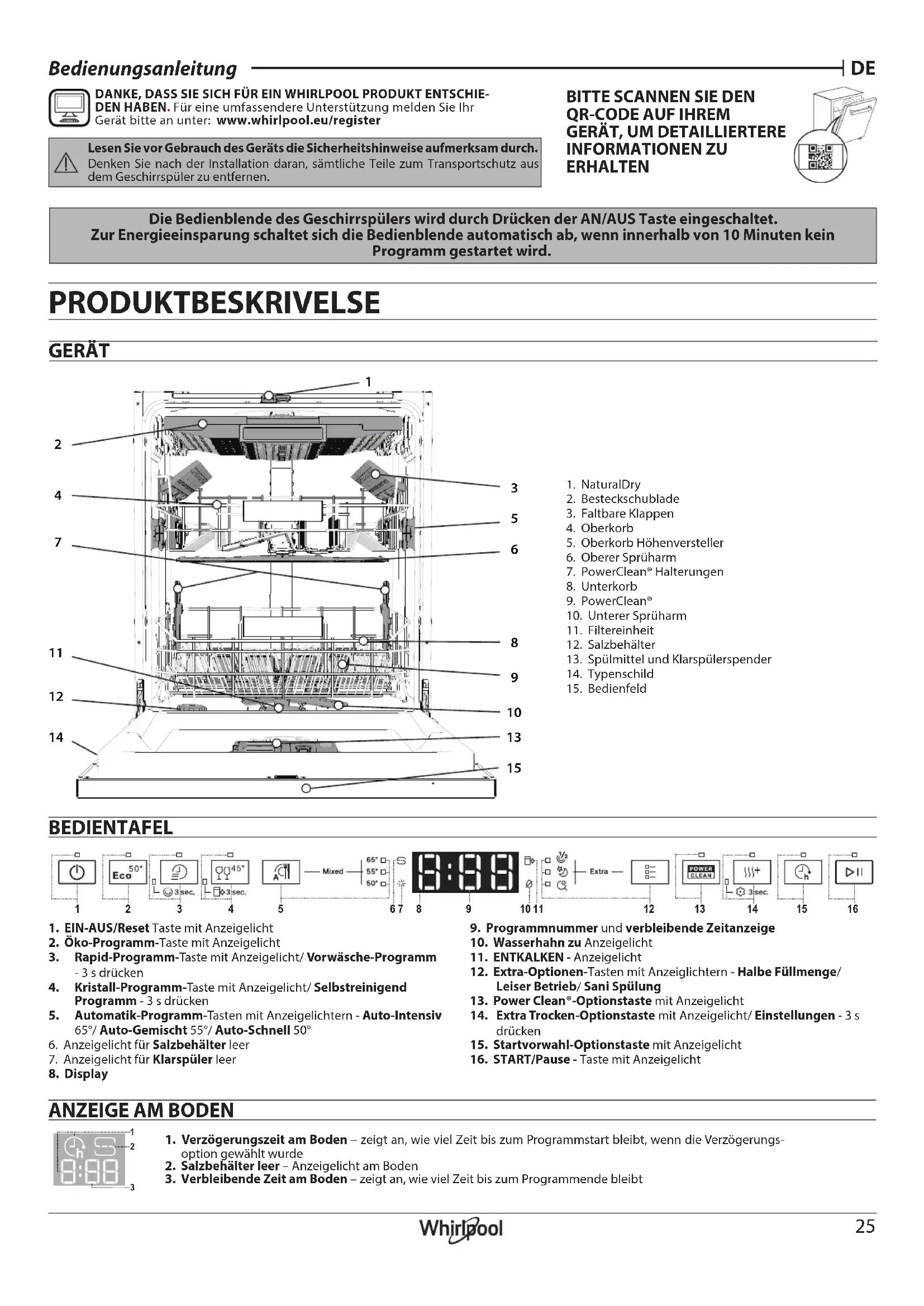 option gewählt wurde2. Salzbehälter leer – Anzeigelicht am Boden3. Verbleibende Zeit am Boden – zeigt an, wie viel Zeit bis zum Programmende bleibtDANKE, DASS SIE SICH FÜR EIN WHIRLPOOL PRODUKT ENTSCHIE-DEN HABEN. Für eine umfassendere Unterstützung melden Sie Ihr Gerät bitte an unter: www.whirlpool.eu/registerLesen Sie vor Gebrauch des Geräts die Sicherheitshinweise aufmerksam durch. Denken Sie nach der Installation daran, sämtliche Teile zum Transportschutz aus dem Geschirrspüler zu entfernen.
