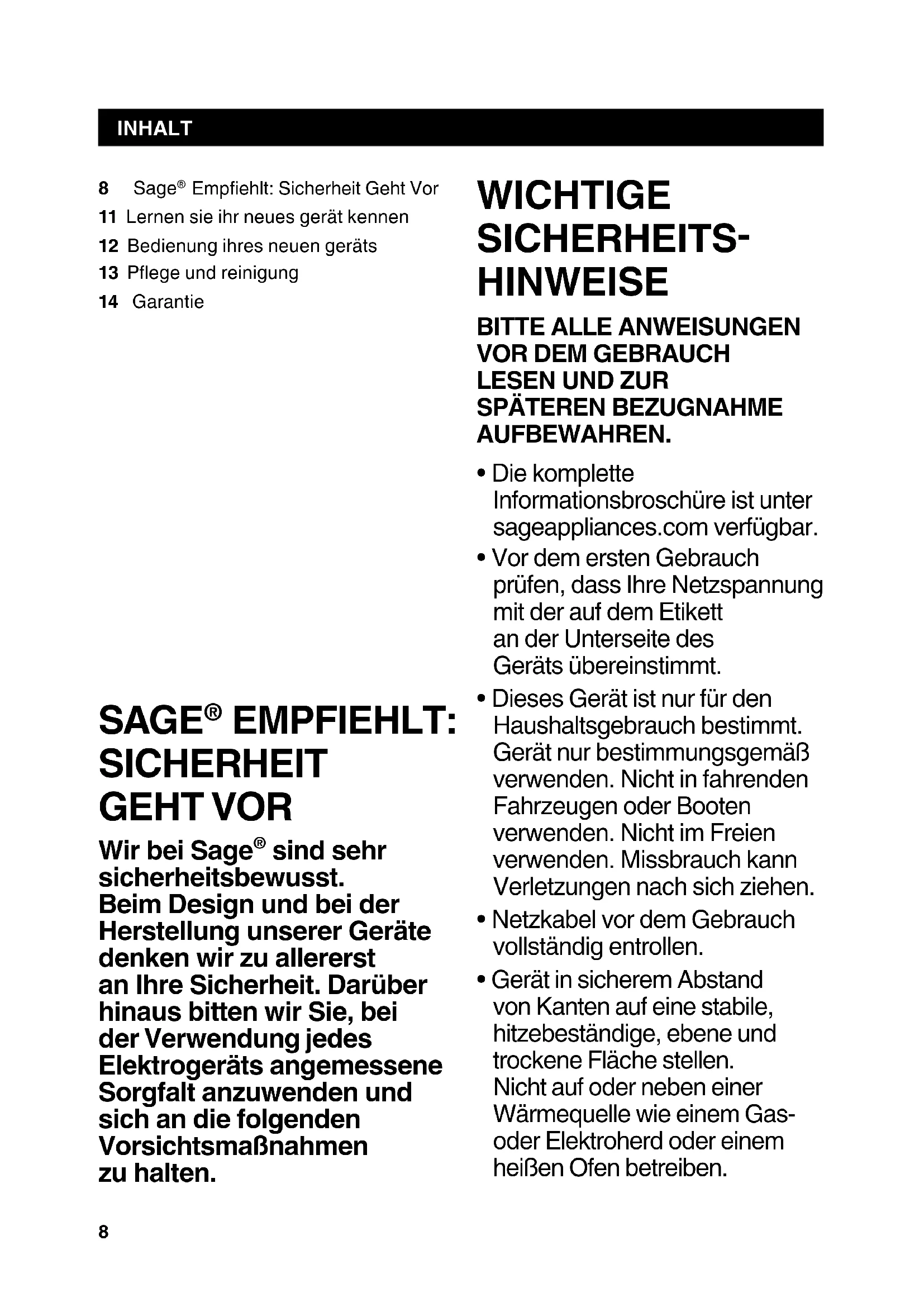 sind sehr sicherheitsbewusst. Beim Design und bei der Herstellung unserer Geräte denken wir zu allererst an Ihre Sicherheit. Darüber hinaus bitten wir Sie, bei der Verwendung jedes Elektrogeräts angemessene Sorgfalt anzuwenden und sich an die folgenden Vorsichtsmaßnahmen zu halten. 8 Sage Empehlt: Sicherheit Geht Vor11 Lernen sie ihr neues gerät kennen12 Bedienung ihres neuen geräts13 Pege und reinigung14 Garantie9