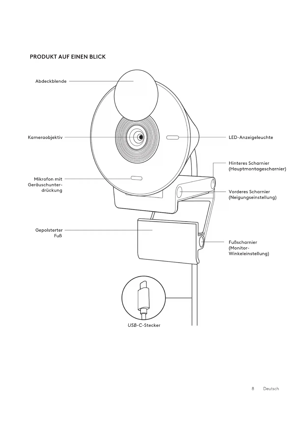 Stecken Sie den beigefügten USB-C-Stecker in denentsprechenden Anschluss an IhremComputer. Wenn möglich, empfehlenwir, Brio 300 direkt in Ihren Computer und keinen USB-Hub hierfür zu verwenden. 10DeutschÖFFNEN DER EXTERNEN ABDECKBLENDE Önen Sie die Abdeckblende durch vorsichtiges Drücken von links oder rechts. Dadurch bewegt sich die Abdeckung in ihre „Aus“-Position oberhalb der Kamera.