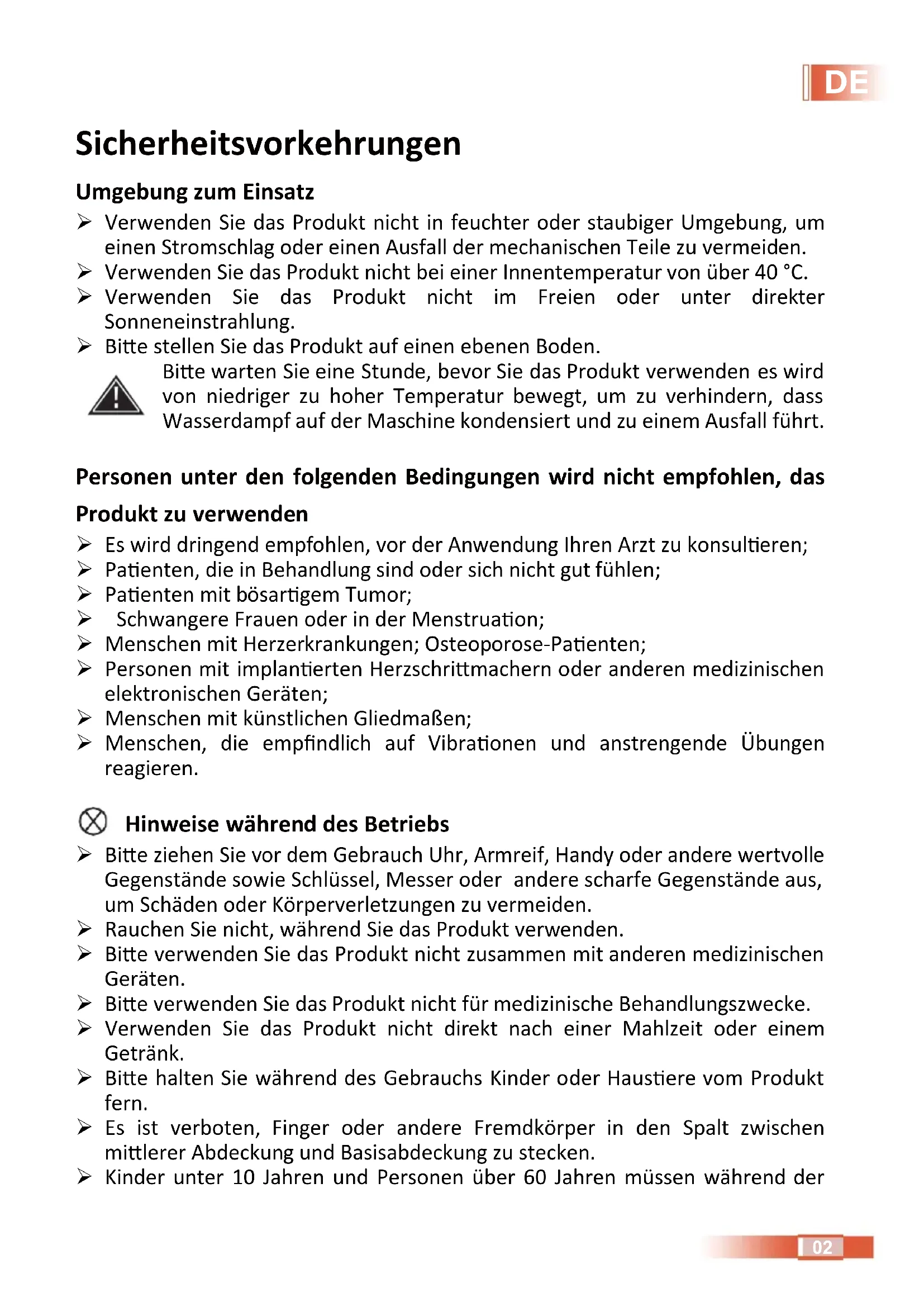 21 22 23 24 25 26 27 28 29 30Sicherheitsvorkehrungen Umgebung zum Einsatz Verwenden Sie das Produkt nicht in feuchter oder staubiger Umgebung, um einen Stromschlag oder einen Ausfall der mechanischen Teile zu vermeiden. Verwenden Sie das Produkt nicht bei einer Innentemperatur von über 40 °C. Verwenden Sie das Produkt nicht im Freien oder unter direkter Sonneneinstrahlung. e stellen Sie das Produkt auf einen ebenen Boden. e warten Sie eine Stunde, bevor Sie das Produkt verwenden es wird von niedriger zu hoher Temperatur bewegt, um zu verhindern, dass Wasserdampf auf der Maschine kondensiert und zu einem Ausfall führt. Personen unter den folgenden Bedingungen wird nicht empfohlen, das Produkt zu verwenden Es wird dringend empfohlen, vor der Anwendung Ihren Arzt zu konsuleren; Pten, die in Behandlung sind oder sich nicht gut fühlen; Pten mit bögem Tumor; Schwangere Frauen oder in der Menstruaon; Menschen mit Herzerkrankungen; Osteoporose-Pnten; Personen mit implanerten Herzschrimachern oder anderen medizinischen elektronischen Geräten; Menschen mit künstlichen Gliedmaßen; Menschen, die empndlich auf Vibonen und anstrengende Übungen reagieren. Hinweise während des Betriebs e ziehen Sie vor dem Gebrauch Uhr, Armreif, Handy oder andere wertvolle Gegenstände sowie Schlüssel, Messer oder andere scharfe Gegenstände aus, um Schäden oder Körperverletzungen zu vermeiden. Rauchen Sie nicht, während Sie das Produkt verwenden. e verwenden Sie das Produkt nicht zusammen mit anderen medizinischen Geräten. e verwenden Sie das Produkt nicht für medizinische Behandlungszwecke. Verwenden Sie das Produkt nicht direkt nach einer Mahlzeit oder einem Getränk. e halten Sie während des Gebrauchs Kinder oder Haue vom Produkt fern. Es ist verboten, Finger oder andere Fremdkörper in den Spalt zwischen mlerer Abdeckung und Basisabdeckung zu stecken. Kinder unter 10 Jahren und Personen über 60 Jahren müssen während der