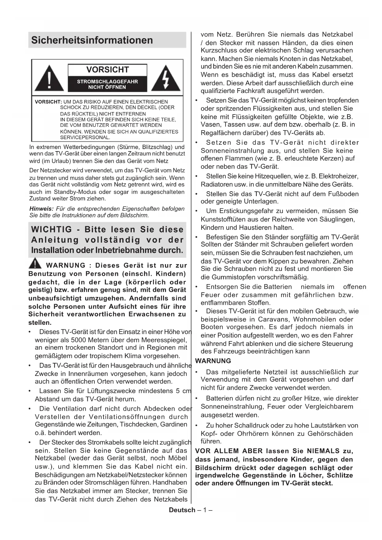 - Dieses TV-Gerät ist für den mobilen Gebrauch, wie beispielsweise in Caravans, Wohnmobilen oder Booten vorgesehen. Es darf jedoch niemals in einer Position aufgestellt werden, wo es den Fahrer während Fahrt ablenken und die sichere Steuerung des Fahrzeugs beeinträchtigen kann WARNUNG