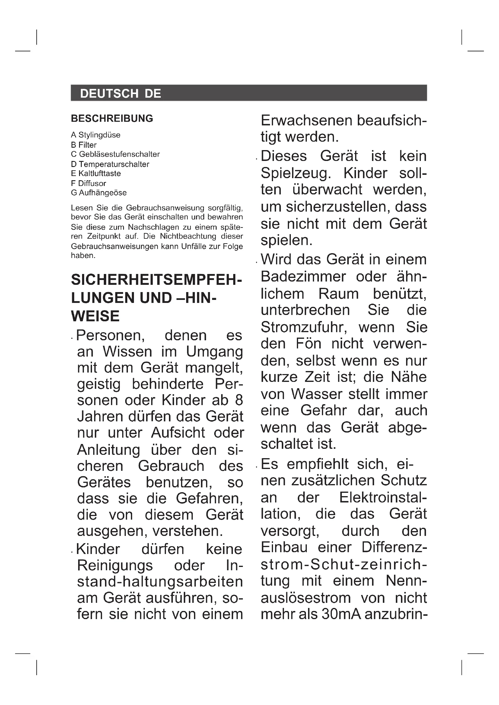 - Wird das Gerät in einem Badezimmer oder ähn- lichem Raum benützt, unterbrechen Sie die Stromzufuhr, wenn Sie den Fön nicht verwen- den, selbst wenn es nur kurze Zeit ist; die Nähe von Wasser stellt immer eine Gefahr dar, auch wenn das Gerät abge- schaltet ist.