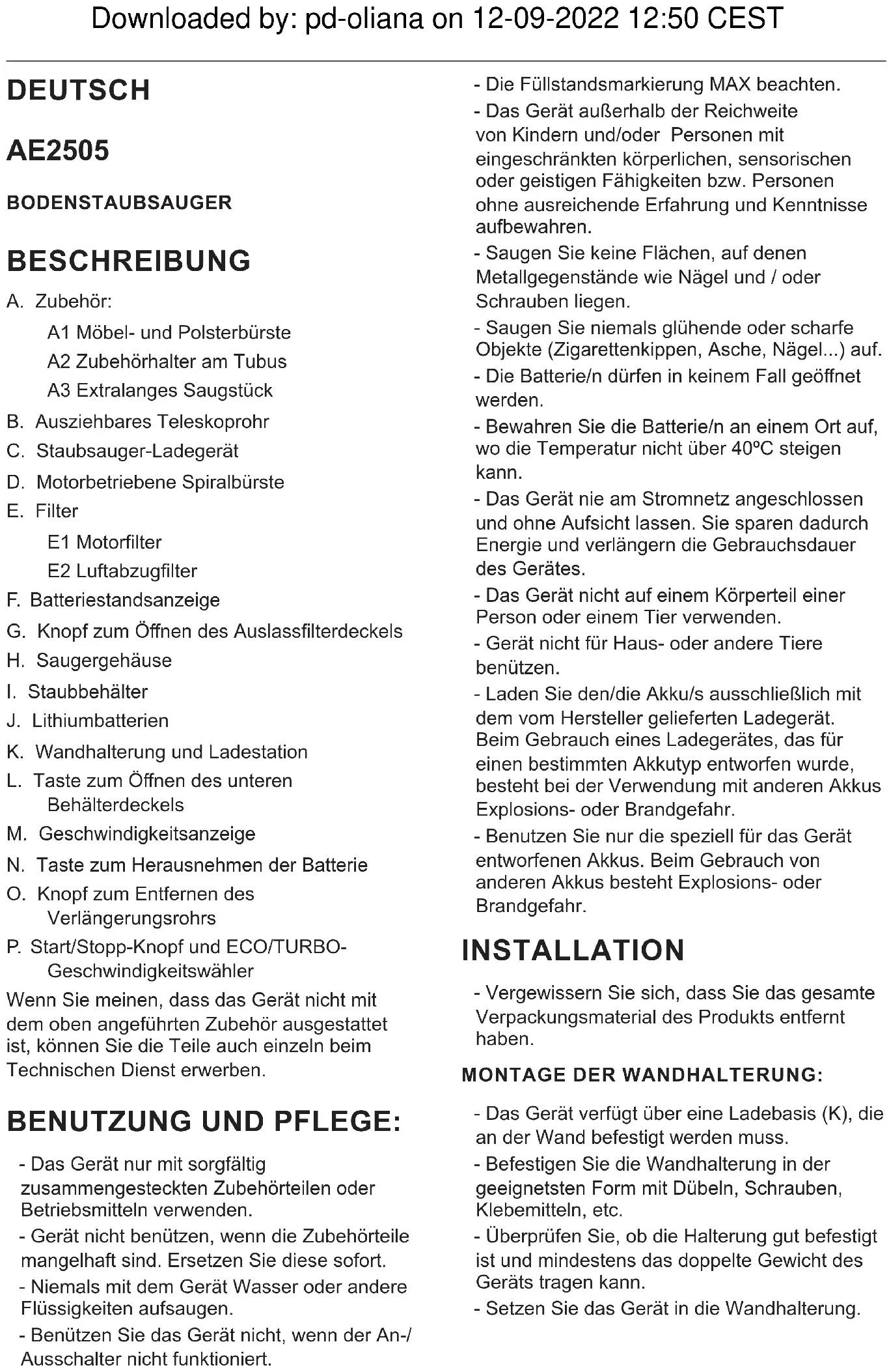 HANDSTAUBSAUGER: - Der Handstaubsauger ist so gestaltet, dass folgendes Zubehör angebracht werden kann: (benutzen Sie jeweils die Kombination, die Ihren Anforderungen am besten entspricht). (Fig.1). - Bürstendüse: Sie ist an der Spitze mit einer Bürste versehen, mit der die Oberäche gleichzeitig mit dem Saugen gebürstet wird. - Fugendüse: Speziell geeignet für Rillen und schwer zugängliche Ecken. - Die Zubehörteile können in die Schlauchspitze eingesetzt werden. NACH DER BENUTZUNG DES GERÄTS: - Stellen Sie das Gerät mit dem An-/Ausschalter ab. - Reinigen Sie das Gerät. REINIGUNG - Ziehen Sie den Stecker heraus und lassen Sie das Gerät abkühlen, bevor Sie mit der Reinigung beginnen. - Reinigen Sie das Gerät mit einem feuchten Tuch, auf das Sie einige Tropfen Reinigungsmittel geben, und trocknen Sie es danach ab. - Verwenden Sie zur Reinigung des Geräts weder Löse- oder Scheuermittel noch Produkte mit einem sauren oder basischen pH-Wert wie z.B. Lauge. - Das Gerät nicht in Wasser oder andere Flüssigkeiten tauchen und nicht unter den Wasserhahn halten. ENTLEEREN DES STAUBBEHÄLTERS: (FIG. 2) - Den Staubbehälter entleeren, sobald Sie durch dessen durchsichtige Wände erkennen, dass er voll ist, oder wenn sie eine spürbare Verminde- rung der Saugleistung bemerken. - Trennen Sie das Verlängerungsrohr durch Drüc- ken der Taste (O) - Önen Sie den Entleerungsdeckel des Tanks, indem Sie die Taste zum Önen des unteren Tankdeckels (L) an der Vorderseite des Geräts drücken und schütten Sie den Inhalt in einen geeigneten Abfallbehälter. - Überprüfen Sie den Zustand des Filters des Downloaded by: pd-oliana on 12-09-2022 12:50 CESTBehälters WECHSEL DER FILTER: - Es wird ein Behälterlter vom Typ EPA (hoche- zienter Luftlter, der Sporen, Asche, Milben, Pollen...zurückhält) empfohlen den Zustand des Filters regelmässig überprüfen, er muss alle 50 Nutzungsstunden gereinigt / ersetzt werden, oder wenn sich eine erhebliche Minderung der Saugleistung des Geräts zeigt. ZUM ENTNEHMEN DER FILTER: (FIG. 3) MOTORFILTER: - Önen Sie den Staubbehälter, indem Sie die Taste zum Önen des Behälters (L) drücken. - Entnehmen Sie den Zyklon, indem Sie ihn nach links drehen, wie durch den Pfeil und die Schlösser am Zyklon angezeigt. - Entfernen Sie den EPA-Filter aus seiner Verankerung, indem Sie den Filter nach links drehen, wie durch den Pfeil und die Sperren angezeigt. - Filter waschen und an der Luft trocknen lassen. - Zur Montage des Filters führen Sie die oben genannten Schritte in umgekehrter Reihenfolge durch. LUFTABZUGFILTER: (FIG. 4) - Drücken Sie den Önungsknopf der Auslassl- terabdeckung (G) und entfernen Sie den Filter aus seiner Verankerung. - Waschen Sie den Filter und lassen Sie ihn an der Luft trocknen. ZUM HERAUSNEHMEN DER BÜRSTE: - Im unteren Teil des Schuhs müssen Sie den Hebel an der Seite aktivieren, um das Teil zu lösen, das die Bürste hält, und dann daran ziehen, um sie zu entfernen (Abb. 5). - Die Bürste herausnehmen und reinigen. - Für die Montage bitte in umgekehrter Reihen- folge die vorstehend beschriebenen Schritte ausführen. ERSATZTEILE - Bei Vertretern und oziellen Verkaufsstellen für Ersatzteile (wie Filter, Schuhbürste und Batterie- set) für das entsprechende Modell. - Verwenden Sie stets für Ihr Gerät geeignete Originalteile. - Betriebsmittel sind in Fachgeschäften erhältlich. WIE SIE DIE BATTERIEN AUS DEM GERÄT ENTFERNEN: - Warnung: Es ist wichtig, dass die Batterien vollständig leer sind, bevor Sie sie aus dem Gerät entfernen. - Warnung: Beim Entnehmen der Batterien darf das Gerät nicht ans Netz geschlossen sein. Zum Entfernen der Batterien am Ende der Lebensdauer des Gerätes verfahren Sie wie folgt: - Entfernen Sie die Batterie aus dem Produkt, indem Sie die Batteriefreigabetaste (N) drücken und ziehen. (Abb.6) Downloaded by: pd-oliana on 12-09-2022 12:50 CESTPORTUGUÊS AE2505 ASPIRADOR VERTICAL DESCRIÇÃO A. Acessórios A1 Bico e escova para móveis e carpetes A2 Suporte de acessórios no tubo A3 Bico extra longo B. Tubo de extensão C. Carregador do aspirador D. Escova motorizada Spiral E. Filtros E1 Filtro do motor E2 Filtro de saída F. Indicador do estado das baterias. G. Botão de abertura tampa do ltro de saída H. Corpo do aspirador