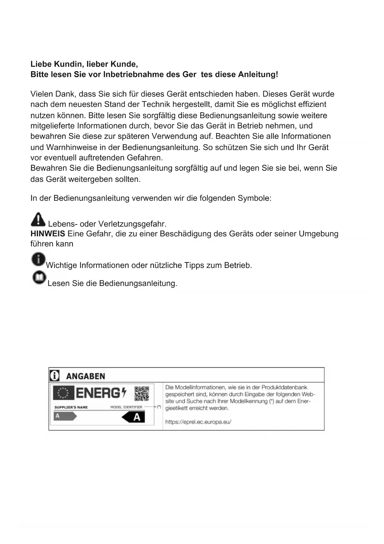 - Wir übernehmen keine Haftung für Schäden, die durch unsachgemäßen Umgang entstehen. Aufstellung und Reparaturen dürfen nur durch einen autorisierten Kundendienst erfolgen. Verwenden Sie nur Original-Ersatzteile und -Zubehör. Originalersatzteile werden ab dem Kaufdatum des Produktes 10 Jahre lang bereitgestellt. Reparieren oder ersetzen Sie nur Geräteteile, bei denen dies ausdrücklich in der Bedienungsanleitung steht. Nehmen Sie keine Änderungen am Gerät vor.