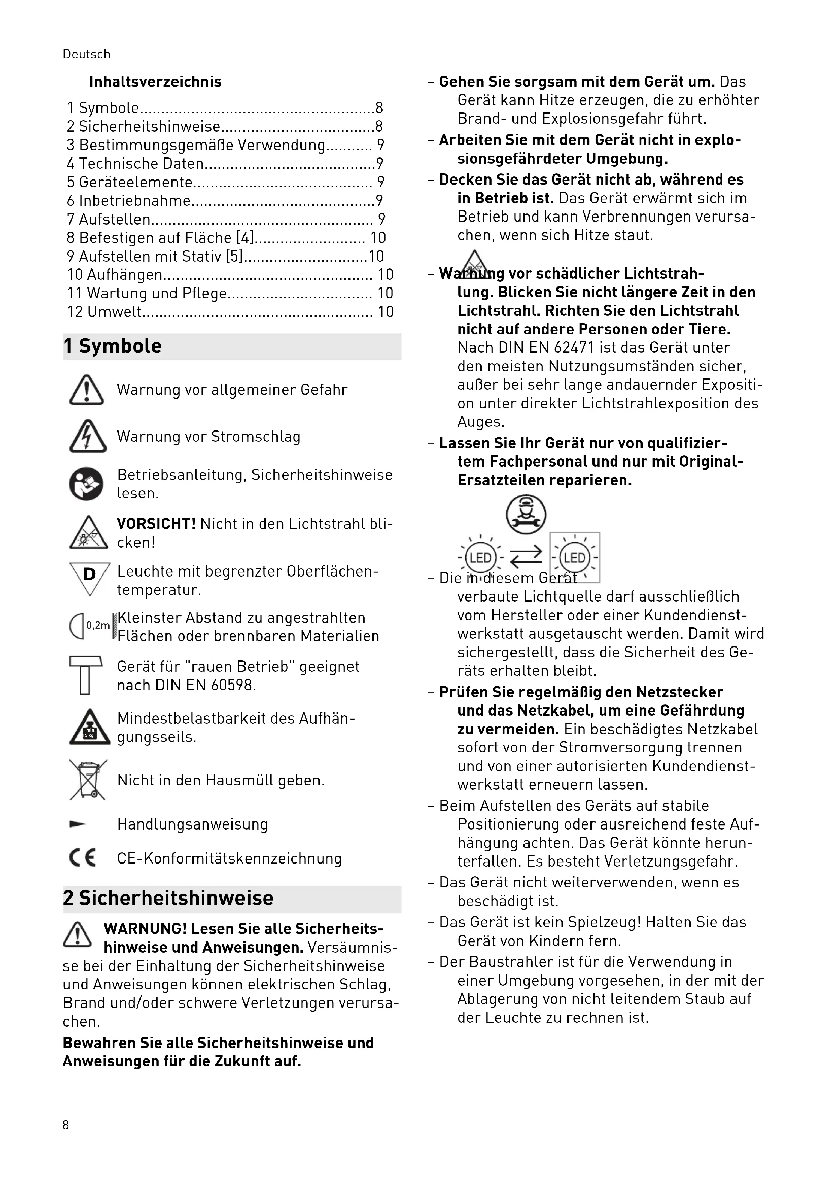 Leuchte mit begrenzter Oberflächen temperatur. 0,2m Kleinster Abstand zu angestrahlten Flächen oder brennbaren Materialien Gerät für "rauen Betrieb" geeignet nach DIN EN 60598. min. 15 kg Mindestbelastbarkeit des Aufhän gungsseils. Nicht in den Hausmüll geben. Handlungsanweisung CE-Konformitätskennzeichnung 2 Sicherheitshinweise WARNUNG! Lesen Sie alle Sicherheits hinweise und Anweisungen. Versäumnis se bei der Einhaltung der Sicherheitshinweise und Anweisungen können elektrischen Schlag, Brand und/oder schwere Verletzungen verursa chen. Bewahren Sie alle Sicherheitshinweise und Anweisungen für die Zukunft auf. – Gehen Sie sorgsam mit dem Gerät um. Das Gerät kann Hitze erzeugen, die zu erhöhter Brand- und Explosionsgefahr führt. – Arbeiten Sie mit dem Gerät nicht in explo sionsgefährdeter Umgebung. – Decken Sie das Gerät nicht ab, während es in Betrieb ist. Das Gerät erwärmt sich im Betrieb und kann Verbrennungen verursa chen, wenn sich Hitze staut. – Warnung vor schädlicher Lichtstrah lung. Blicken Sie nicht längere Zeit in den Lichtstrahl. Richten Sie den Lichtstrahl nicht auf andere Personen oder Tiere. Nach DINEN62471 ist das Gerät unter den meisten Nutzungsumständen sicher, außer bei sehr lange andauernder Expositi on unter direkter Lichtstrahlexposition des Auges. – Lassen Sie Ihr Gerät nur von qualifizier tem Fachpersonal und nur mit Original- Ersatzteilen reparieren. – Die in diesem Gerät verbaute Lichtquelle darf ausschließlich vom Hersteller oder einer Kundendienst werkstatt ausgetauscht werden. Damit wird sichergestellt, dass die Sicherheit des Ge räts erhalten bleibt. – Prüfen Sie regelmäßig den Netzstecker und das Netzkabel, um eine Gefährdung zu vermeiden. Ein beschädigtes Netzkabel sofort von der Stromversorgung trennen und von einer autorisierten Kundendienst werkstatt erneuern lassen. – Beim Aufstellen des Geräts auf stabile Positionierung oder ausreichend feste Auf hängung achten. Das Gerät könnte herun terfallen. Es besteht Verletzungsgefahr. – Das Gerät nicht weiterverwenden, wenn es beschädigt ist. – Das Gerät ist kein Spielzeug! Halten Sie das Gerät von Kindern fern. – Der Baustrahler ist für die Verwendung in einer Umgebung vorgesehen, in der mit der Ablagerung von nicht leitendem Staub auf der Leuchte zu rechnen ist. Deutsch 83 Bestimmungsgemäße Verwendung Der Baustrahler ist zum großflächigen Be leuchten von Baustellenbereichen, Arbeitsräu men, Garagen usw. geeignet. Auf die elektri sche Sicherheit der Stromanschlussstelle ist zu achten. Das Gerät ist nicht zur Raumbeleuchtung im Haushalt geeignet. Bei nicht bestimmungsgemäßem Ge brauch haftet der Benutzer. ACHTUNG In einigen Staaten existieren zusätzliche Vorschriften für den Einsatz von elektrischen Betriebsmitteln auf Baustel len. Diese nationalen Vorschriften können die Verwendung des Baustrahlers einschränken oder zusätzlich Anforderungen stellen. Beach ten sie die für Sie geltenden nationalen Bestim mungen!. 4 Technische Daten Baustrahler SYSLITE DUO Nennspannung 220 - 240 V Frequenz 50/60 Hz Leuchtmittel 80 x 1,4 W Power LED Maximalleistung 112 W LED-Lichtstrom 8000 lm Farbtemperatur 5000 K Farbwiedergabe RA >80 Lebensdauer (L70) >10.000 h Gewicht 3,4 kg Schutzart IP 55 Dieses Gerät enthält eine Lichtquelle der Ener gieeffizienzklasseE. 5 Geräteelemente [1-1] Abziehbarer Standfuß, Kabelaufwick lung [1-2] Leuchtfläche [1-3] Handgriff [1-4] Wandhaken, Kabelklemme [1-5] Netzanschlussleitung Die angegebenen Abbildungen befinden sich am Anfang der Betriebsanleitung. 6 Inbetriebnahme