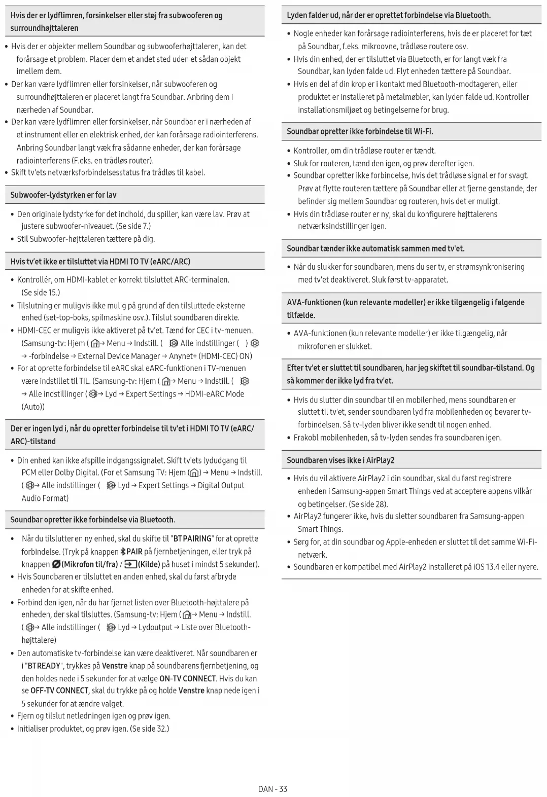 - Soundbaren er kompatibel med AirPlay2 installeret på iOS 13.4 eller nyere.DEU - 2 INHALT 01 Überprüfen der Komponenten 3 02 Produktübersicht 4 Oberer Steuerungsbereich der Soundbar . . . . . . . . . . . . . . . . . . . . . . . . . . . . . . . . . . . . .4 Unterer Steuerungsbereich der Soundbar. . . . . . . . . . . . . . . . . . . . . . . . . . . . . . . . . . . . .5 03 Verwendung der Fernbedienung der Soundbar 6 Einlegen der Batterien vor der Verwendung der Fernbedienung (AAA-Batterien X 2). . . . . . . . . . . . . . . . . . . . . . . . . . . . . . . . . . . . . . . . . . . . . . . . . . . . . . . . .6 So verwenden Sie die Fernbedienung . . . . . . . . . . . . . . . . . . . . . . . . . . . . . . . . . . . . . . . .6 Aktive Sprachverstärkung (AVA). . . . . . . . . . . . . . . . . . . . . . . . . . . . . . . . . . . . . . . . . . . . .8 Verwenden der verborgenen Tasten (Tasten mit mehr als einer Funktion). . . . . . .8 Technische Daten für die Ausgabe der unterschiedlichen Sound-Effekt-Modi . . .8 Anpassen der Soundbar-Lautstärke mit einer TV-Fernbedienung. . . . . . . . . . . . . .10 04 Verbinden der Soundbar 11 Strom- und Geräteanschluss . . . . . . . . . . . . . . . . . . . . . . . . . . . . . . . . . . . . . . . . . . . . . . . 11 ‒ Empfohlenes Lautsprecher-Layout . . . . . . . . . . . . . . . . . . . . . . . . . . . . . . . . . . . . . 12 ‒ Surround speaker-Modus (nur HW-Q9**C, HW-Q9**GC) . . . . . . . . . . . . . . . . . 12 ‒ Manuelles Anschließen des Subwoofers oder der Surround-Lautsprecher . . . . . . . . . . . . . . . . . . . . . . . . . . . . . . . . . . . . . . . . . . . . . . . . 13 ‒ LED-Anzeigelichter auf der Rückseite des Subwoofers und der Surround-Lautsprecher . . . . . . . . . . . . . . . . . . . . . . . . . . . . . . . . . . . . . . . . . . . . . . . . 14 05 Verbindung mit einem TV-Gerät 15 Anschließen des Fernsehgeräts, welches HDMI ARC (Audio Return Channel) unterstützt. . . . . . . . . . . . . . . . . . . . . . . . . . . . . . . . . . . . . . . . .15 Verbindung mit einem optischen Kabel . . . . . . . . . . . . . . . . . . . . . . . . . . . . . . . . . . . . .16 Verbindung per Bluetooth. . . . . . . . . . . . . . . . . . . . . . . . . . . . . . . . . . . . . . . . . . . . . . . . . .17 Verbinden über Wi-Fi . . . . . . . . . . . . . . . . . . . . . . . . . . . . . . . . . . . . . . . . . . . . . . . . . . . . . .19 Verwenden der Q-Symphony-Funktion. . . . . . . . . . . . . . . . . . . . . . . . . . . . . . . . . . . . . 20 Verwendung von SpaceFit Sound . . . . . . . . . . . . . . . . . . . . . . . . . . . . . . . . . . . . . . . . . . .21 06 Verbinden eines externen Geräts 22 Methode 1. Verbindung über ein HDMI-Kabel (mit Unterstützung der Dekodierung und Wiedergabe von Dolby Atmos/DTS:X) . . . . . . . . . . . . . . . . . . . . . .22 Methode 2. Verbindung mit einem optischen Kabel . . . . . . . . . . . . . . . . . . . . . . . . . .23 07 Verbinden eines Mobilgeräts 24 Methode 1. Verbindung per Bluetooth . . . . . . . . . . . . . . . . . . . . . . . . . . . . . . . . . . . . . . .24 Methode 2. Verbinden per WLAN (Drahtloses Netzwerk). . . . . . . . . . . . . . . . . . . . . .26 Verwendung von Tap Sound . . . . . . . . . . . . . . . . . . . . . . . . . . . . . . . . . . . . . . . . . . . . . . . .27 08 Herstellen einer Verbindung über Apple Airplay 2 28 09 Installieren der Wandhalterung 29 Vorsichtsmaßnahmen bei der Montage . . . . . . . . . . . . . . . . . . . . . . . . . . . . . . . . . . . . .29 Komponenten der Wandhalterung . . . . . . . . . . . . . . . . . . . . . . . . . . . . . . . . . . . . . . . . . .29 Installation der Surround-Lautsprecher an der Wand (nur bei entsprechenden Modellen) . . . . . . . . . . . . . . . . . . . . . . . . . . . . . . . . . . . . . . . . 30 10 Installieren der Soundbar vor dem TV-Gerät 30 Bestandteil. . . . . . . . . . . . . . . . . . . . . . . . . . . . . . . . . . . . . . . . . . . . . . . . . . . . . . . . . . . . . . . 30 11 Software-Update 31 Automatisches Update. . . . . . . . . . . . . . . . . . . . . . . . . . . . . . . . . . . . . . . . . . . . . . . . . . . . .31 USB-Update. . . . . . . . . . . . . . . . . . . . . . . . . . . . . . . . . . . . . . . . . . . . . . . . . . . . . . . . . . . . . . .31 Initialisierung . . . . . . . . . . . . . . . . . . . . . . . . . . . . . . . . . . . . . . . . . . . . . . . . . . . . . . . . . . . . .32 12 Fehlerbehebung 32DEU - 3