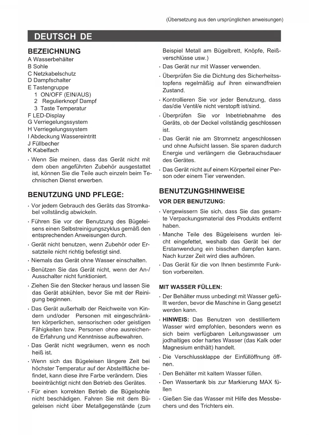 - Les solutions maison, comme l’utilisation de vinaigre, pour les traitements de détartrage de l’appareil, ne sont pas recommandées.ESPAÑOL ES DEUTSCH DE (Übersetzung aus den ursprünglichen anweisungen) BEZEICHNUNG A Wasserbehälter B Sohle C Netzkabelschutz D Dampfschalter E Tastengruppe 1 ON/OFF (EIN/AUS) 2 Regulierknopf Dampf 3 Taste Temperatur F LED-Display G Verriegelungssystem H Verriegelungssystem I Abdeckung Wassereintritt J Füllbecher K Kabelfach