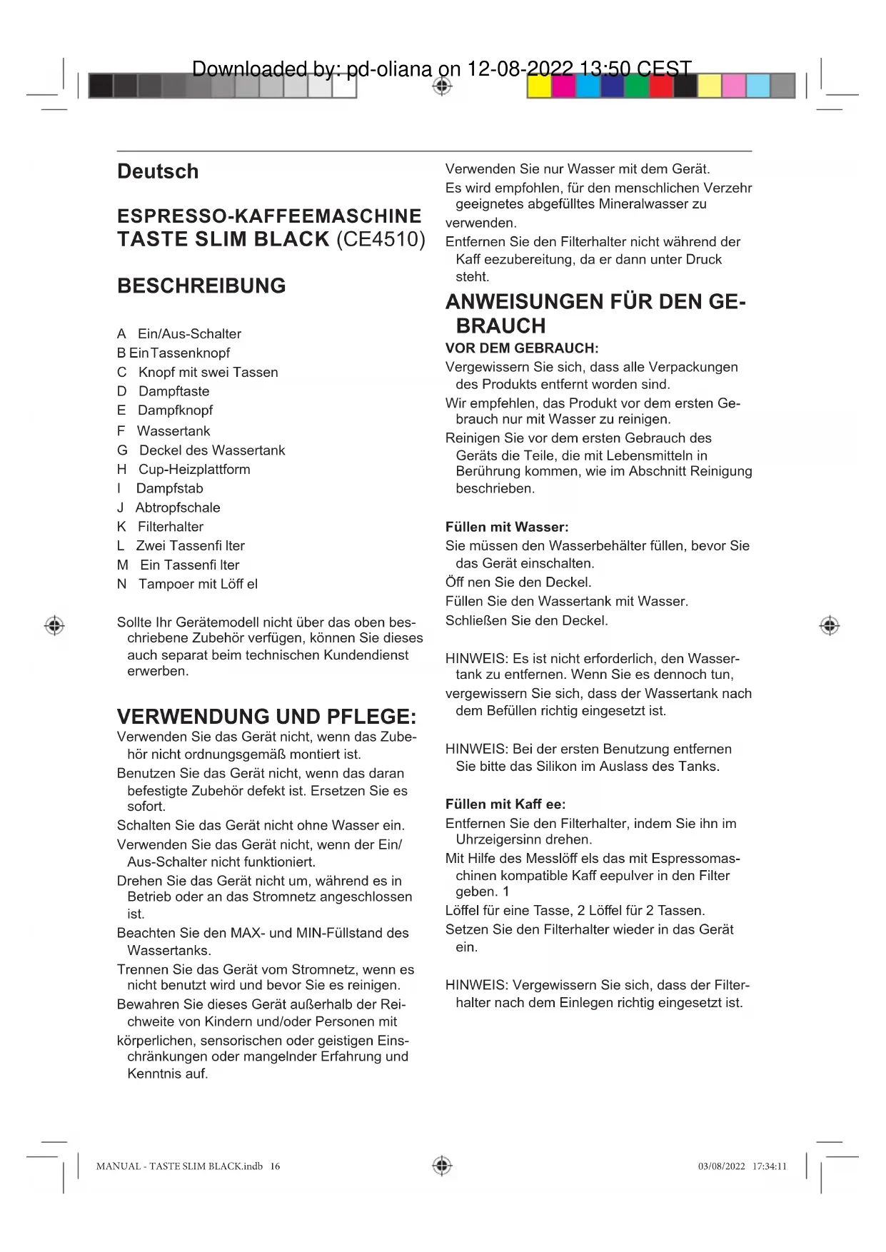 BRAUCH VOR DEM GEBRAUCH: Vergewissern Sie sich, dass alle Verpackungen des Produkts entfernt worden sind. Wir empfehlen, das Produkt vor dem ersten Ge- brauch nur mit Wasser zu reinigen. Reinigen Sie vor dem ersten Gebrauch des Geräts die Teile, die mit Lebensmitteln in Berührung kommen, wie im Abschnitt Reinigung beschrieben. Füllen mit Wasser: Sie müssen den Wasserbehälter füllen, bevor Sie das Gerät einschalten. Öff nen Sie den Deckel. Füllen Sie den Wassertank mit Wasser. Schließen Sie den Deckel. HINWEIS: Es ist nicht erforderlich, den Wasser- tank zu entfernen. Wenn Sie es dennoch tun, vergewissern Sie sich, dass der Wassertank nach dem Befüllen richtig eingesetzt ist. HINWEIS: Bei der ersten Benutzung entfernen Sie bitte das Silikon im Auslass des Tanks. Füllen mit Kaff ee: Entfernen Sie den Filterhalter, indem Sie ihn im Uhrzeigersinn drehen. Mit Hilfe des Messlöff els das mit Espressomas- chinen kompatible Kaff eepulver in den Filter geben. 1 Löff el für eine Tasse, 2 Löff el für 2 Tassen. Setzen Sie den Filterhalter wieder in das Gerät ein. HINWEIS: Vergewissern Sie sich, dass der Filter- halter nach dem Einlegen richtig eingesetzt ist. MANUAL - TASTE SLIM BLACK.indb 16MANUAL - TASTE SLIM BLACK.indb 16 03/08/2022 17:34:1103/08/2022 17:34:11 Downloaded by: pd-oliana on 12-08-2022 13:50 CESTVERWENDUNG: Schließen Sie das Gerät an das Stromnetz an. Drücken Sie den Ein/Aus-Schalter. Die Kon- trollleuchte auf den Tasten für eine und zwei Tassen beginnt zu blinken und zeigt damit an, dass die Kaff eemaschine vorgeheizt wird. Sobald sie aufhören zu blinken, geht die Kaff ee- maschine in den Heizmodus über und ist bereit, den gewünschten Kaff ee zu brühen. Einen Kaff ee kochen Befolgen Sie die zuvor angegebenen Schritte für die Befüllung einer Tasse Pulverkaff ee. Sobald der Filterhalter an seinem Platz ist, drüc- ken Sie die Taste 1cup. Die Kaff eemaschine schaltet sich automatisch ab, sobald der Kaff ee aufgebrüht ist. Zubereitung von zwei Kaff ees Befolgen Sie die zuvor angegebenen Schritte für das Einfüllen von zwei Tassen Pulverkaff ee. Sobald der Filterhalter an seinem Platz ist, drüc- ken Sie die 2-Tassen-Taste. Die Kaff eemaschine schaltet sich automatisch ab, wenn beide Kaff eesorten aufgebrüht sind. Zubereitung von ESE-Kaff eepads Befolgen Sie die zuvor angegebenen Schritte für das Einfüllen von Pulverkaff ee in eine Tasse, ABER legen Sie anstelle des Pulverkaff ees die ESE-Pad in den Filter. Sobald der Filterhalter an seinem Platz ist, drüc- ken Sie die Taste 1cup. Die Kaff eemaschine schaltet sich automatisch ab, sobald der Kaff ee aufgebrüht ist. HINWEIS: Der gebrühte Kaff ee kann sich gerin- gfügig von dem einer Kaff eemaschine für Pads unterscheiden. Heißes Wasser Stellen Sie eine Tasse aus der erhitzten Position unter das Dampfrohr. Öff nen Sie den Dampfknopf und drehen Sie ihn nach vorne. Es tritt heißes Wasser aus. Zum Abschluss schließen Sie das Wassersystem, indem Sie den Drehknopf zurückdrehen. Milch aufschäumen Drücken Sie in der beheizten Position die Dampf- taste. Sie beginnt zu blinken. Sobald die Taste nicht mehr blinkt, ist das Gerät bereit, Trockendampf zu erzeugen. Stellen Sie eine Vase mit Milch unter das Dam- pfrohr und führen Sie den Dampfschlauch so weit ein, dass sich der Auslass fast am Boden der Vase befi ndet. Öff nen Sie den Dampfdrehknopf und drehen Sie ihn nach vorne. Das Geräusch des austreten- den Dampfes ist zu hören. Regulieren Sie die Temperatur durch Berührung mit der Vase und schließen Sie den Dampfkno- pf, wenn Sie sehen, dass sie fertig ist. HINWEIS: Wenn Sie nach Beendigung des Dam- pfvorgangs zur Kaff eeextraktion zurückkehren möchten, müssen Sie die Taste für einen oder zwei Kaff ees drücken und den Druck ablassen, indem Sie die Schritte unter HEISSES WAS- SER in dieser Anleitung befolgen. Wenn Sie ein wenig Wasser ablassen, wird die Temperatur gesenkt und der Druck abgelassen.