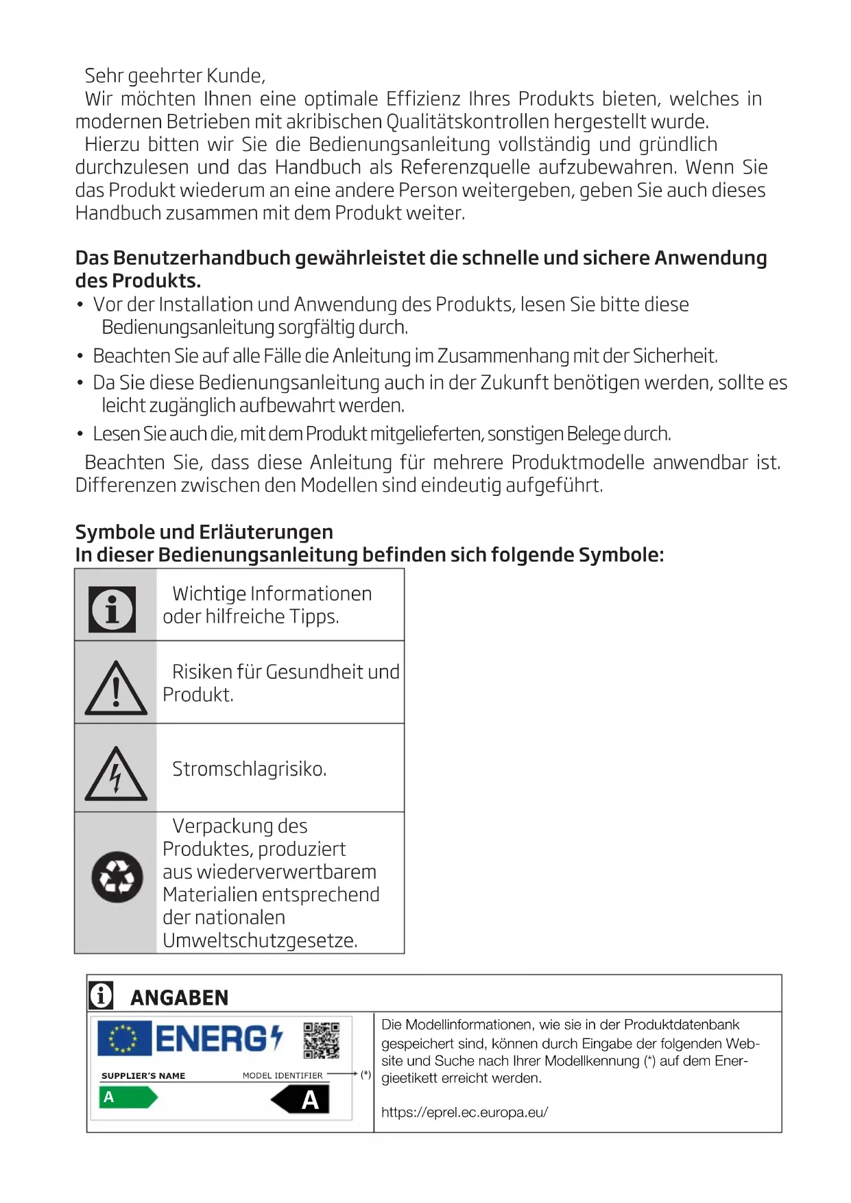 Die Modellinformationen, wie sie in der Produktdatenbank gespeichert sind, können durch Eingabe der folgenden Web-site und Suche nach Ihrer Modellkennung (*) auf dem Ener-gieetikett erreicht werden.https://eprel.ec.europa.eu/
