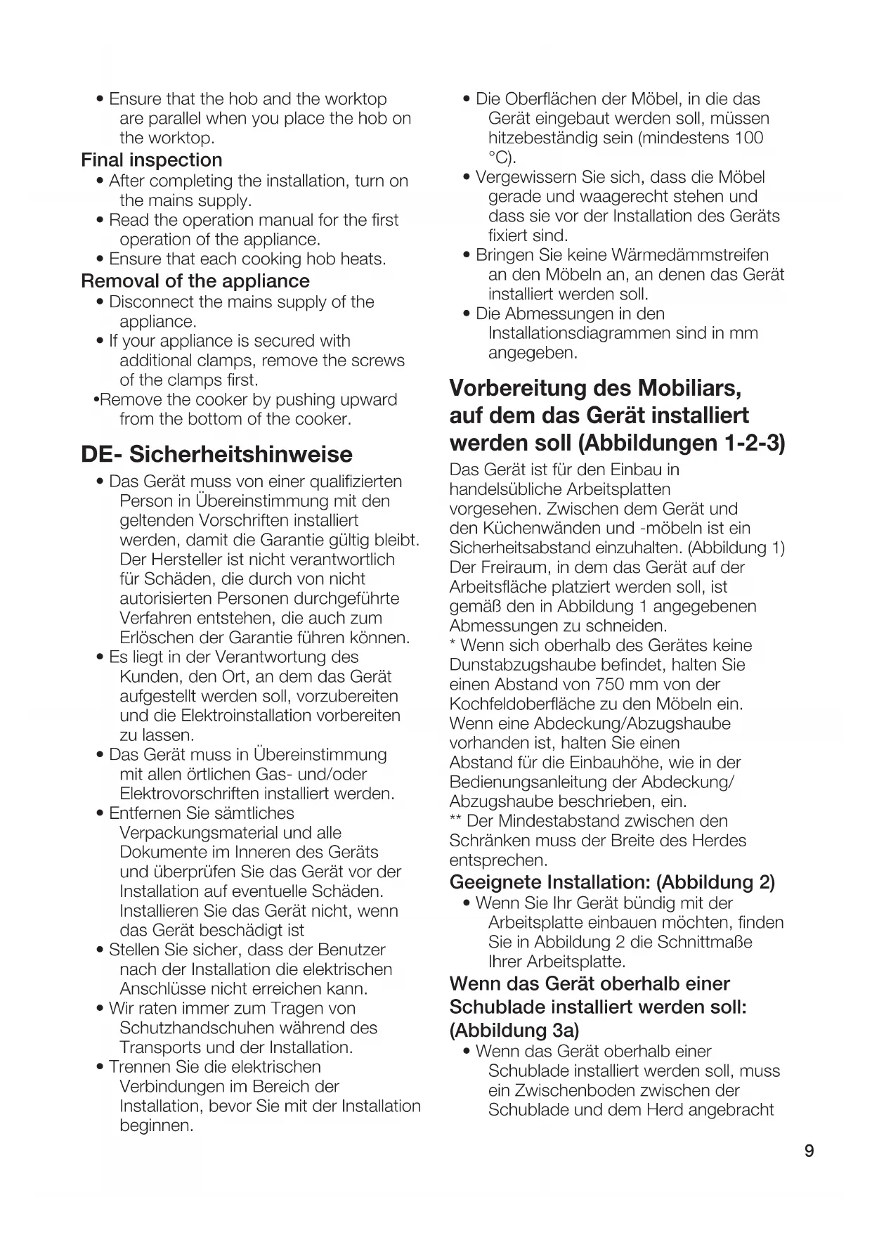 - Die Oberflächen der Möbel, in die das Gerät eingebaut werden soll, müssen hitzebeständig sein (mindestens 100 °C).