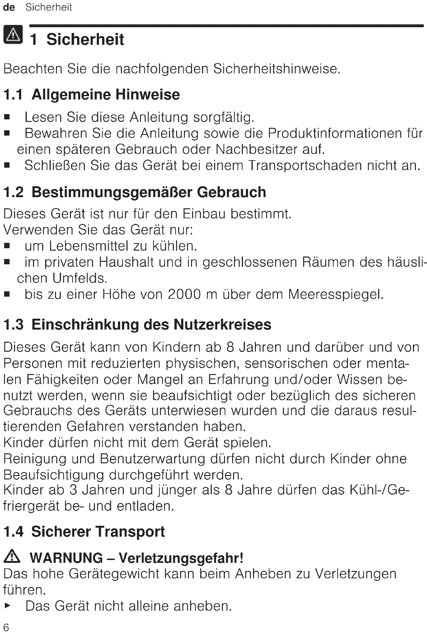 1 Sicherheit Beachten Sie die nachfolgenden Sicherheitshinweise. 1.1 Allgemeine Hinweise ¡ Lesen Sie diese Anleitung sorgfältig. ¡ Bewahren Sie die Anleitung sowie die Produktinformationen für einen späteren Gebrauch oder Nachbesitzer auf. ¡ Schließen Sie das Gerät bei einem Transportschaden nicht an. 1.2 Bestimmungsgemäßer Gebrauch Dieses Gerät ist nur für den Einbau bestimmt. Verwenden Sie das Gerät nur: ¡ um Lebensmittel zu kühlen. ¡ im privaten Haushalt und in geschlossenen Räumen des häusli- chen Umfelds. ¡ bis zu einer Höhe von 2000 m über dem Meeresspiegel. 1.3 Einschränkung des Nutzerkreises Dieses Gerät kann von Kindern ab 8 Jahren und darüber und von Personen mit reduzierten physischen, sensorischen oder menta- len Fähigkeiten oder Mangel an Erfahrung und/oder Wissen be- nutzt werden, wenn sie beaufsichtigt oder bezüglich des sicheren Gebrauchs des Geräts unterwiesen wurden und die daraus resul- tierenden Gefahren verstanden haben. Kinder dürfen nicht mit dem Gerät spielen. Reinigung und Benutzerwartung dürfen nicht durch Kinder ohne Beaufsichtigung durchgeführt werden. Kinder ab 3Jahren und jünger als 8Jahre dürfen das Kühl-/Ge- friergerät be- und entladen. 1.4 Sicherer Transport WARNUNG‒Verletzungsgefahr! Das hohe Gerätegewicht kann beim Anheben zu Verletzungen führen. ▶ Das Gerät nicht alleine anheben.Sicherheit de