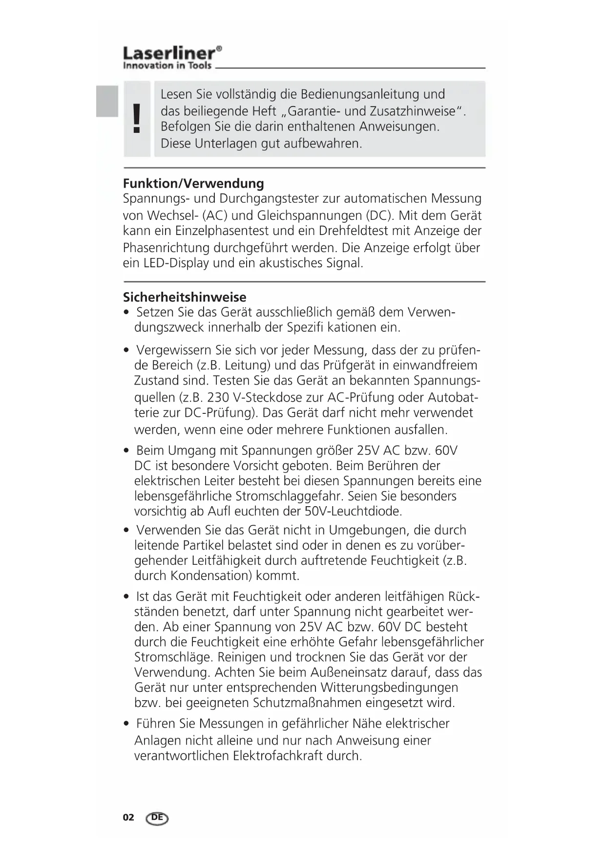 Funktion/Verwendung Spannungs- und Durchgangstester zur automatischen Messung von Wechsel- (AC) und Gleichspannungen (DC). Mit dem Gerät kann ein Einzelphasentest und ein Drehfeldtest mit Anzeige der Phasenrichtung durchgeführt werden. Die Anzeige erfolgt über ein LED-Display und ein akustisches Signal. Sicherheitshinweise