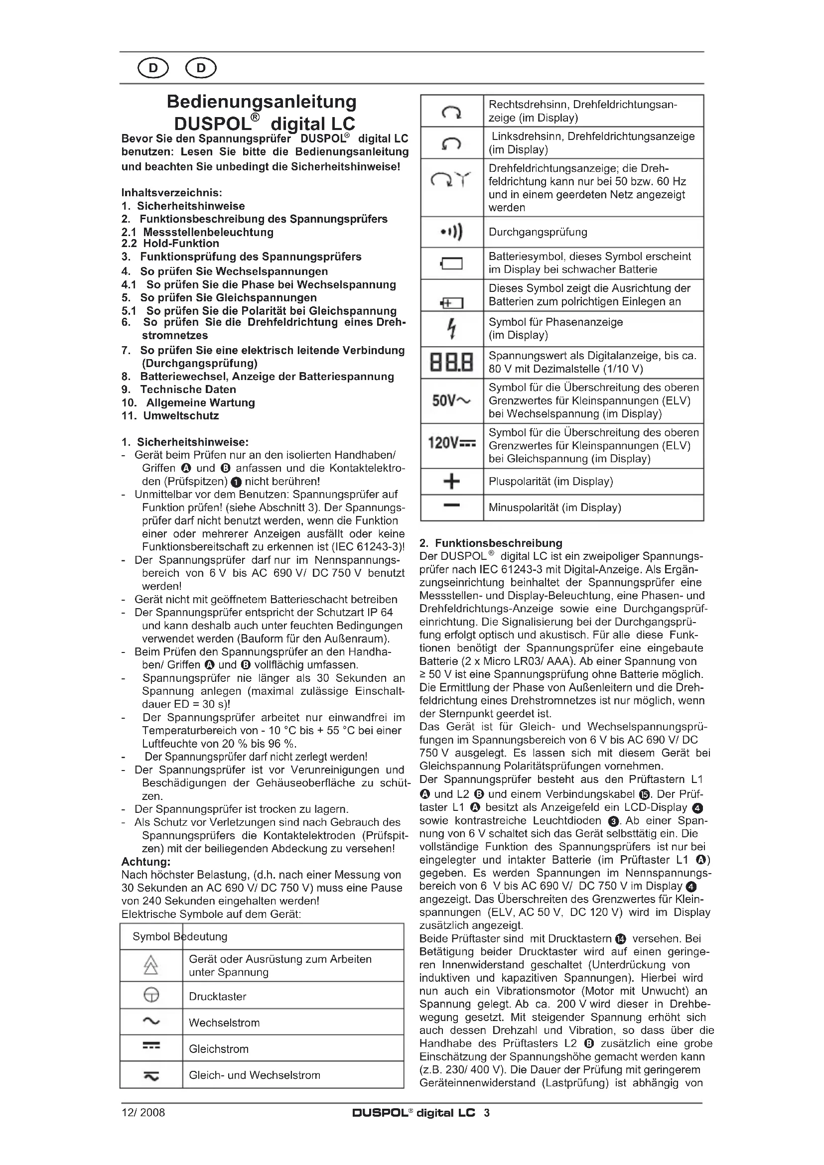 digital LC ist ein zweipoliger Spannungs- prüfer nach IEC 61243-3 mit Digital-Anzeige. Als Ergän- zungseinrichtung beinhaltet der Spannungsprüfer eine Messstellen- und Display-Beleuchtung, eine Phasen- und Drehfeldrichtungs-Anzeige sowie eine Durchgangsprüf- einrichtung. Die Signalisierung bei der Durchgangsprü- fung erfolgt optisch und akustisch. Für alle diese Funk- tionen benötigt der Spannungsprüfer eine eingebaute Batterie (2 x Micro LR03/ AAA). Ab einer Spannung von ≥ 50 V ist eine Spannungsprüfung ohne Batterie möglich. Die Ermittlung der Phase von Außenleitern und die Dreh- feldrichtung eines Drehstromnetzes ist nur möglich, wenn der Sternpunkt geerdet ist. Das Gerät ist für Gleich- und Wechselspannungsprü- fungen im Spannungsbereich von 6 V bis AC 690 V/ DC 750 V ausgelegt. Es lassen sich mit diesem Gerät bei Gleichspannung Polaritätsprüfungen vornehmen. Der Spannungsprüfer besteht aus den Prüftastern L1 A und L2 B und einem Verbindungskabel . Der Prüf- taster L1 A besitzt als Anzeigefeld ein LCD-Display 4 sowie kontrastreiche Leuchtdioden 3. Ab einer Span- nung von 6 V schaltet sich das Gerät selbsttätig ein. Die vollständige Funktion des Spannungsprüfers ist nur bei eingelegter und intakter Batterie (im Prüftaster L1 A) gegeben. Es werden Spannungen im Nennspannungs- bereich von 6 V bis AC 690 V/ DC 750 V im Display 4 angezeigt. Das Überschreiten des Grenzwertes für Klein- spannungen (ELV, AC 50 V, DC 120 V) wird im Display zusätzlich angezeigt. Beide Prüftaster sind mit Drucktastern N versehen. Bei Betätigung beider Drucktaster wird auf einen geringe- ren Innenwiderstand geschaltet (Unterdrückung von induktiven und kapazitiven Spannungen). Hierbei wird nun auch ein Vibrationsmotor (Motor mit Unwucht) an Spannung gelegt. Ab ca. 200 V wird dieser in Drehbe- wegung gesetzt. Mit steigender Spannung erhöht sich auch dessen Drehzahl und Vibration, so dass über die Handhabe des Prüftasters L2 B zusätzlich eine grobe Einschätzung der Spannungshöhe gemacht werden kann (z.B. 230/ 400 V). Die Dauer der Prüfung mit geringerem Geräteinnenwiderstand (Lastprüfung) ist abhängig von12/ 2008 DUSPOL