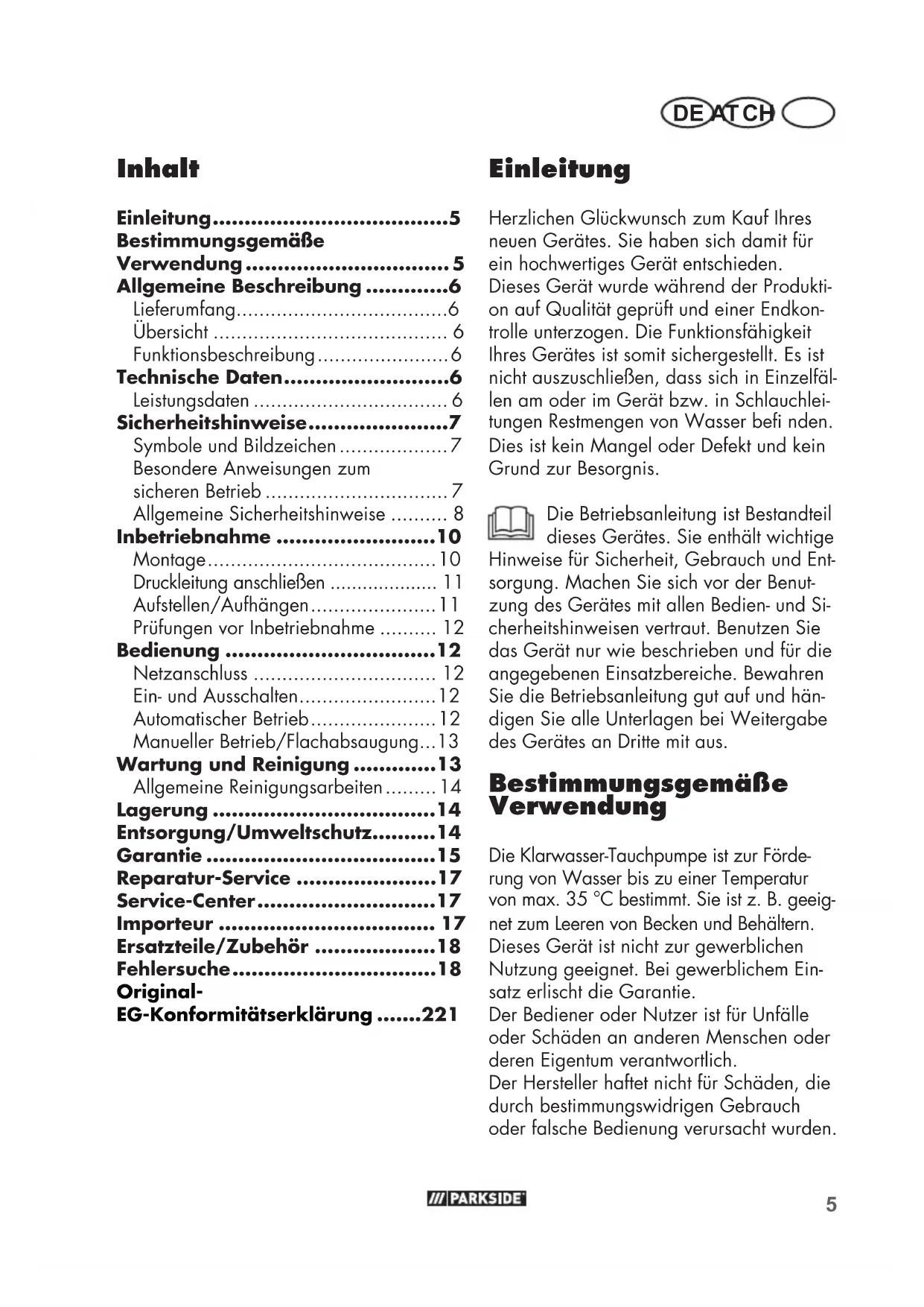 - DE AT CH Einleitung Herzlichen Glückwunsch zum Kauf Ihres neuen Gerätes. Sie haben sich damit für ein hochwertiges Gerät entschieden. Dieses Gerät wurde während der Produkti- on auf Qualität geprüft und einer Endkon- trolle unterzogen. Die Funktionsfähigkeit Ihres Gerätes ist somit sichergestellt. Es ist nicht auszuschließen, dass sich in Einzelfäl- len am oder im Gerät bzw. in Schlauchlei- tungen Restmengen von Wasser be nden. Dies ist kein Mangel oder Defekt und kein Grund zur Besorgnis. Die Betriebsanleitung ist Bestandteil dieses Gerätes. Sie enthält wichtige Hinweise für Sicherheit, Gebrauch und Ent- sorgung. Machen Sie sich vor der Benut- zung des Gerätes mit allen Bedien- und Si- cherheitshinweisen vertraut. Benutzen Sie das Gerät nur wie beschrieben und für die angegebenen Einsatzbereiche. Bewahren Sie die Betriebsanleitung gut auf und hän- digen Sie alle Unterlagen bei Weitergabe des Gerätes an Dritte mit aus. Bestimmungsgemäße Verwendung Die Klarwasser-Tauchpumpe ist zur Förde- rung von Wasser bis zu einer Temperatur von max. 35°C bestimmt. Sie ist z.B. geeig- net zum Leeren von Becken und Behältern. Dieses Gerät ist nicht zur gewerblichen Nutzung geeignet. Bei gewerblichem Ein- satz erlischt die Garantie. Der Bediener oder Nutzer ist für Unfälle oder Schäden an anderen Menschen oder deren Eigentum verantwortlich. Der Hersteller haftet nicht für Schäden, die durch bestimmungswidrigen Gebrauch oder falsche Bedienung verursacht wurden. Inhalt Einleitung p. 5