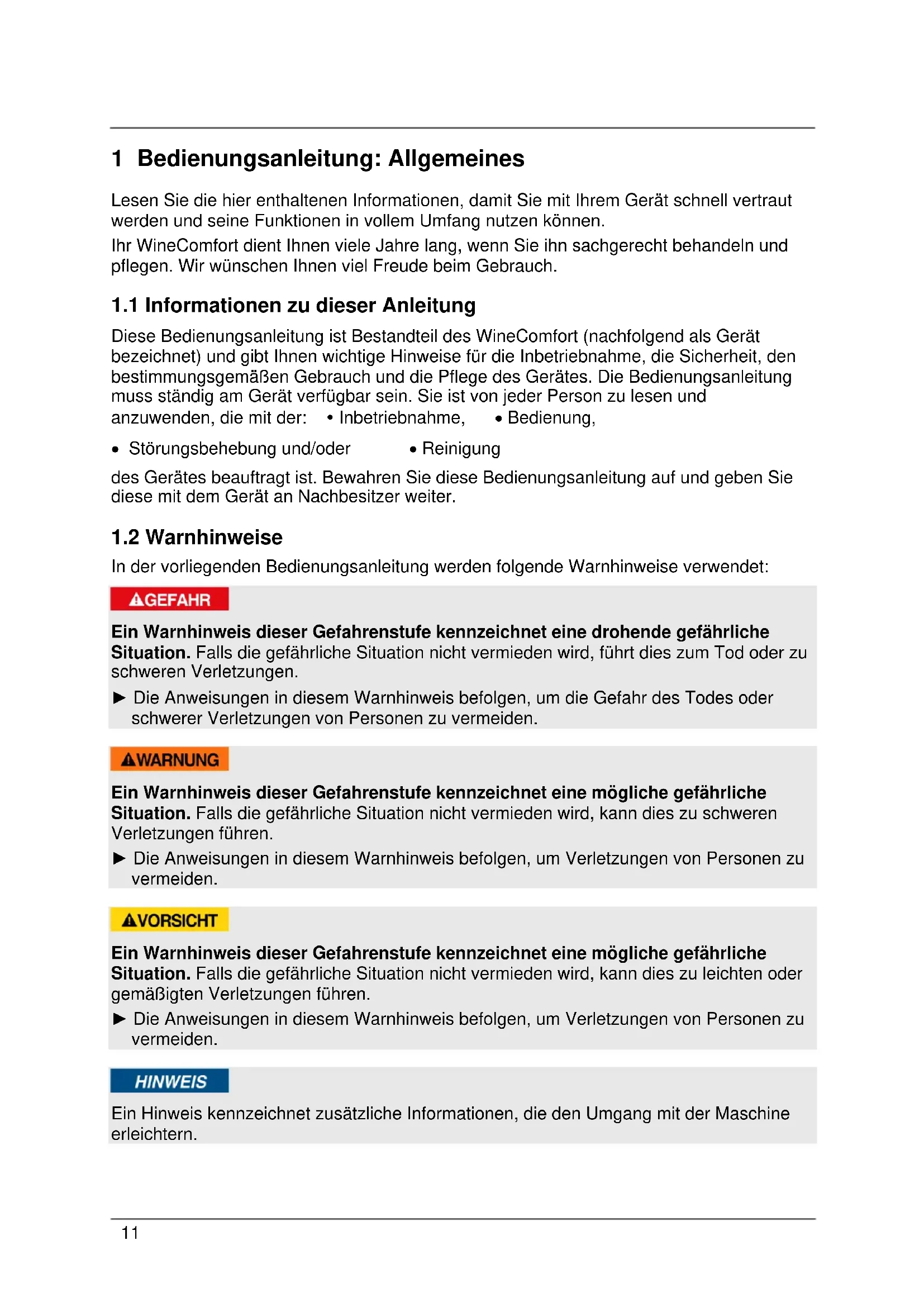 Diese Bedienungsanleitung ist Bestandteil des WineComfort (nachfolgend als Gerät bezeichnet) und gibt Ihnen wichtige Hinweise für die Inbetriebnahme, die Sicherheit, den bestimmungsgemäßen Gebrauch und die Pflege des Gerätes. Die Bedienungsanleitung muss ständig am Gerät verfügbar sein. Sie ist von jeder Person zu lesen und anzuwenden, die mit der: Inbetriebnahme, • Bedienung,