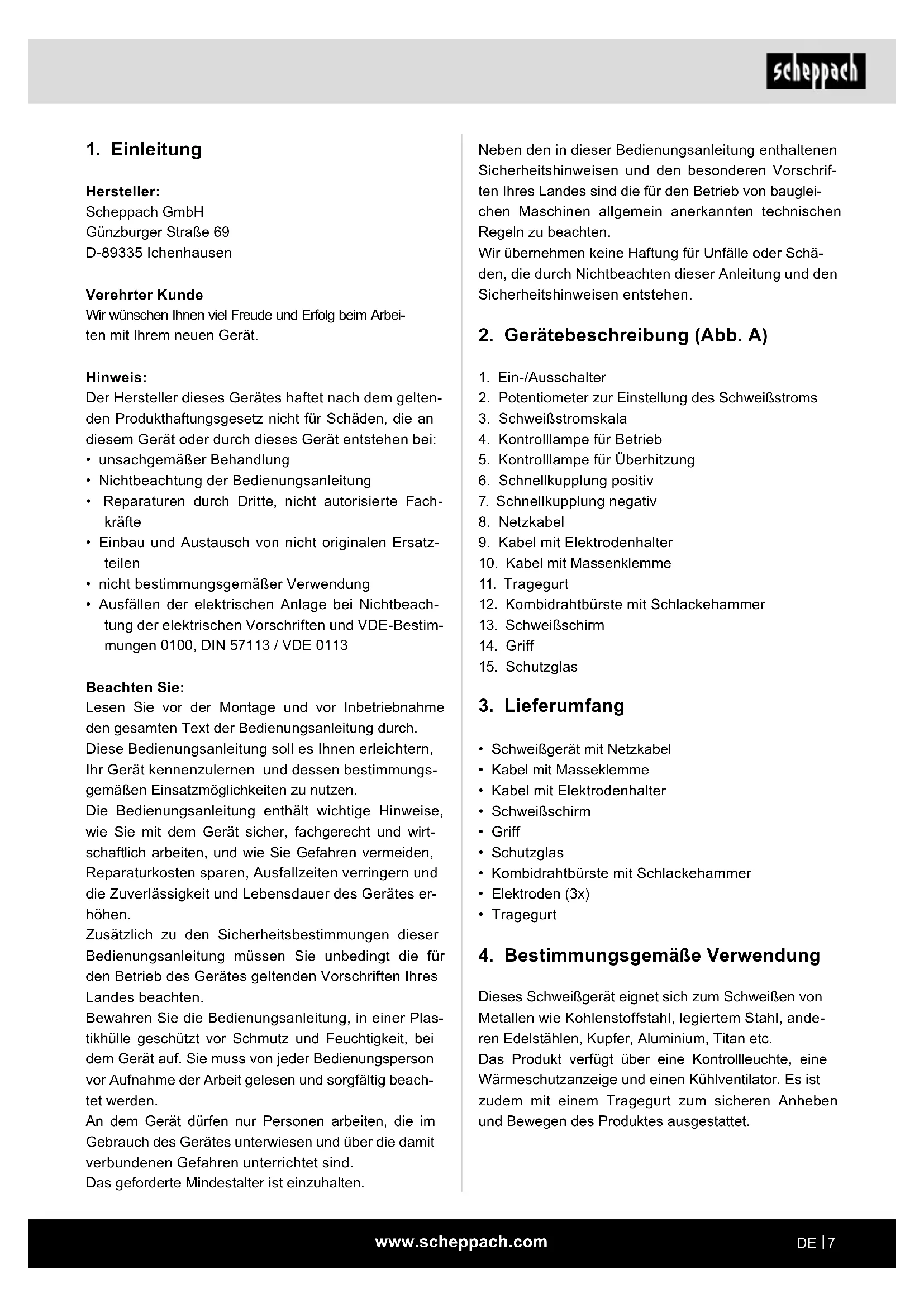 Hersteller: Scheppach GmbH Günzburger Straße 69 D-89335 Ichenhausen Verehrter Kunde Wir wünschen Ihnen viel Freude und Erfolg beim Arbei- ten mit Ihrem neuen Gerät. Hinweis: Der Hersteller dieses Gerätes haftet nach dem gelten- den Produkthaftungsgesetz nicht für Schäden, die an diesem Gerät oder durch dieses Gerät entstehen bei: