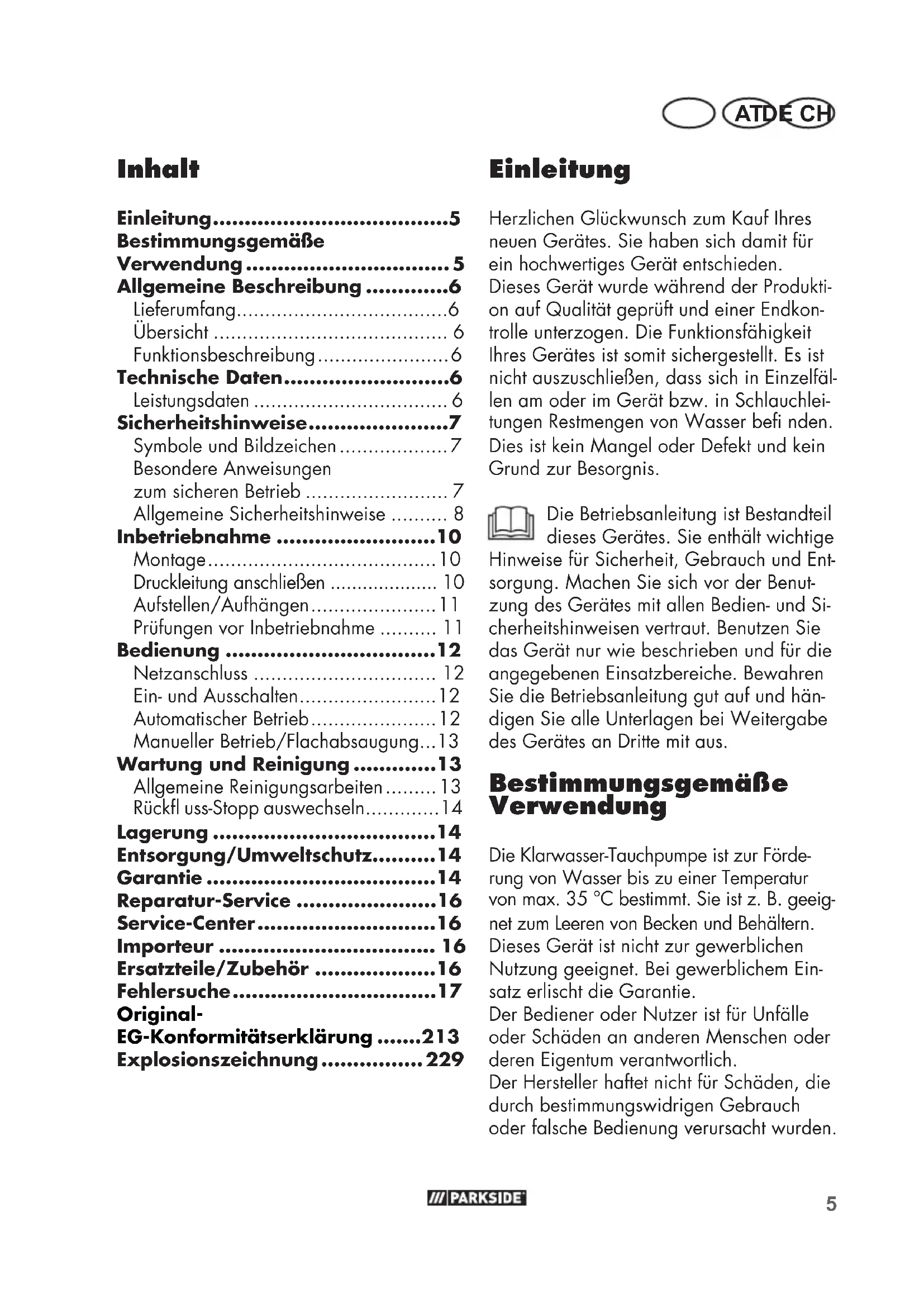 - ATDE CH Einleitung Herzlichen Glückwunsch zum Kauf Ihres neuen Gerätes. Sie haben sich damit für ein hochwertiges Gerät entschieden. Dieses Gerät wurde während der Produkti- on auf Qualität geprüft und einer Endkon- trolle unterzogen. Die Funktionsfähigkeit Ihres Gerätes ist somit sichergestellt. Es ist nicht auszuschließen, dass sich in Einzelfäl- len am oder im Gerät bzw. in Schlauchlei- tungen Restmengen von Wasser befi nden. Dies ist kein Mangel oder Defekt und kein Grund zur Besorgnis. Die Betriebsanleitung ist Bestandteil dieses Gerätes. Sie enthält wichtige Hinweise für Sicherheit, Gebrauch und Ent- sorgung. Machen Sie sich vor der Benut- zung des Gerätes mit allen Bedien- und Si- cherheitshinweisen vertraut. Benutzen Sie das Gerät nur wie beschrieben und für die angegebenen Einsatzbereiche. Bewahren Sie die Betriebsanleitung gut auf und hän- digen Sie alle Unterlagen bei Weitergabe des Gerätes an Dritte mit aus. Bestimmungsgemäße Verwendung Die Klarwasser-Tauchpumpe ist zur Förde- rung von Wasser bis zu einer Temperatur von max. 35°C bestimmt. Sie ist z.B. geeig- net zum Leeren von Becken und Behältern. Dieses Gerät ist nicht zur gewerblichen Nutzung geeignet. Bei gewerblichem Ein- satz erlischt die Garantie. Der Bediener oder Nutzer ist für Unfälle oder Schäden an anderen Menschen oder deren Eigentum verantwortlich. Der Hersteller haftet nicht für Schäden, die durch bestimmungswidrigen Gebrauch oder falsche Bedienung verursacht wurden. Inhalt Einleitung p. 5