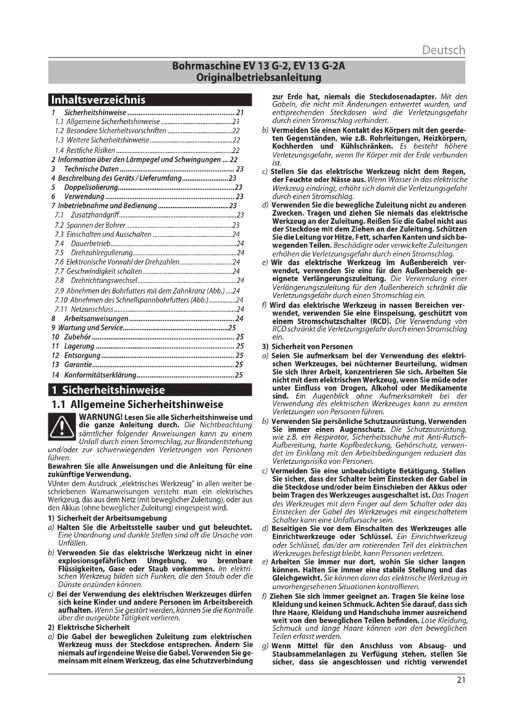 Bohrmaschine EV13G-2, EV13G-2A Originalbetriebsanleitung Inhaltsverzeichnis 1 Sicherheitshinweise .......................................................... 21