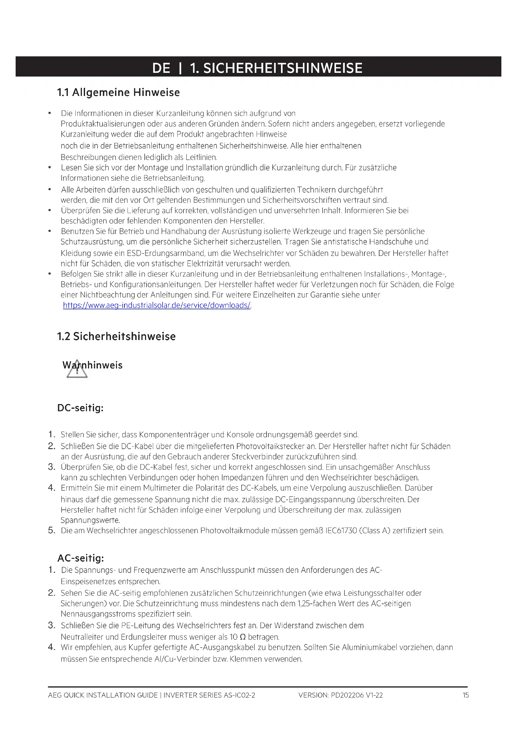 - Befolgen Sie strikt alle in dieser Kurzanleitung und in der Betriebsanleitung enthaltenen Installations-, Montage-, Betriebs- und Konfigurationsanleitungen. Der Hersteller haftet weder für Verletzungen noch für Schäden, die Folge einer Nichtbeachtung der Anleitungen sind. Für weitere Einzelheiten zur Garantie siehe unter https://www.aeg-industrialsolar.de/service/downloads/.