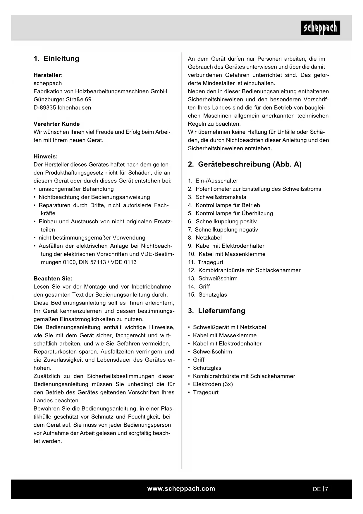 Hersteller: scheppach Fabrikation von Holzbearbeitungsmaschinen GmbH Günzburger Straße 69 D-89335 Ichenhausen Verehrter Kunde Wir wünschen Ihnen viel Freude und Erfolg beim Arbei- ten mit Ihrem neuen Gerät. Hinweis: Der Hersteller dieses Gerätes haftet nach dem gelten- den Produkthaftungsgesetz nicht für Schäden, die an diesem Gerät oder durch dieses Gerät entstehen bei: