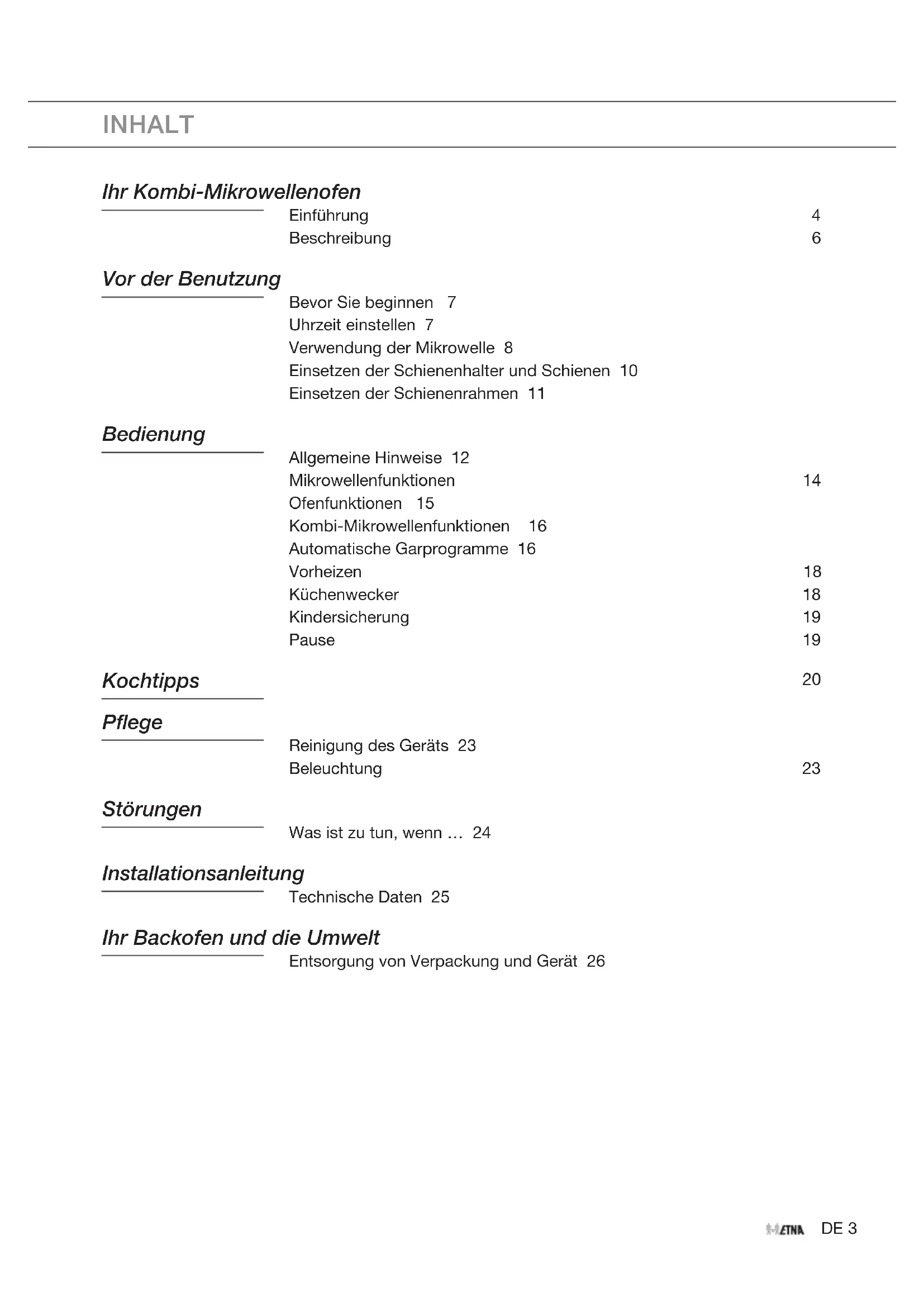 INHALT Ihr Kombi-Mikrowellenofen Einführung 4 Beschreibung 6 Vor der Benutzung Bevor Sie beginnen 7 Uhrzeit einstellen 7 Verwendung der Mikrowelle 8 Einsetzen der Schienenhalter und Schienen 10 Einsetzen der Schienenrahmen 11 Bedienung Allgemeine Hinweise 12 Mikrowellenfunktionen 14 Ofenfunktionen 15 Kombi-Mikrowellenfunktionen 16 Automatische Garprogramme 16 Vorheizen 18 Küchenwecker 18 Kindersicherung 19 Pause 19 Kochtipps