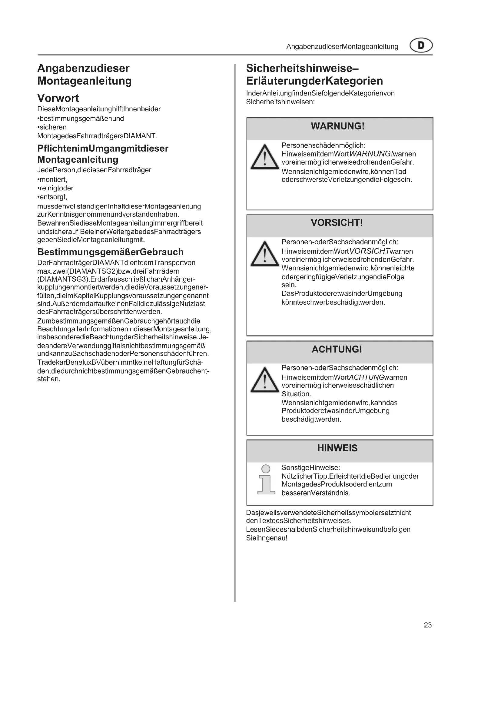 - sicheren Montage des Fahrradträgers DIAMANT. Pflichten im Umgang mit dieser Montageanleitung Jede Person, die diesen Fahrradträger