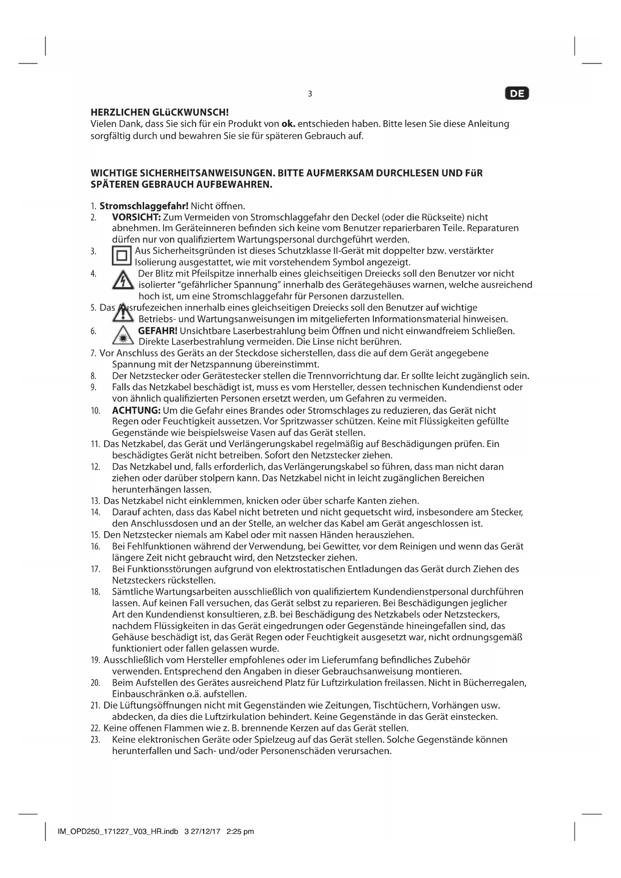 HERZLICHEN GLüCKWUNSCH! Vielen Dank, dass Sie sich für ein Produkt von ok. entschieden haben. Bitte lesen Sie diese Anleitung sorgfältig durch und bewahren Sie sie für späteren Gebrauch auf. WICHTIGE SICHERHEITSANWEISUNGEN. BITTE AUFMERKSAM DURCHLESEN UND FüR SPÄTEREN GEBRAUCH AUFBEWAHREN.