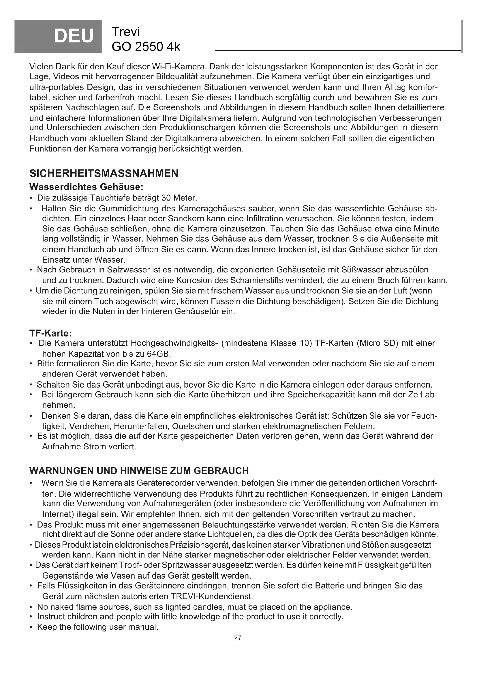 Zur Reinigung empfehlen wir ein weiches, leicht angefeuchtetes Tuch. Vermeiden Sie Lösungsmittel oder scheuernde Substanzen. BEFEHLE BESCHREIBUNG Linse Hauptbildschirm OK/ Auslöser EIN/AUS und Modusauswahl Type-C Micro-SD- Steckplatz Hoch Runter Lautsprecher Batteriefach Ladeanzeige Betriebsanzeige Micro HDMI Frontaler Bildschirm29 Trevi GO 2550 4k DEU WICHTIG Die gute Konstruktion dieses Gerätes garantiert seine einwandfreie Funktion über lange Zeit. Sollten dennoch Probleme auftreten, ist es ratsam, sich an das nächste autorisierte TREVI-Kundendienstzentrum zu wenden. TREVI verfolgt eine Politik der kontinuierlichen Forschung und Entwicklung. Daher können die Produkte von den beschriebenen Eigenschaften abweichen. EIN/AUS und Modusauswahl OK/ Auslöser Hoch Runter WARNUNG: Bitte verschließen Sie das wasserdichte Gehäuse, bevor Sie es ins Wasser tauchen, da es andernfalls zu Undichtigkeiten kommen kann, die Ihre Kamera beschädigen oder zerstören können. Wasser beschädigt sowohl die Kamera als auch den Akku, was zu einer Explosion oder einem Brand führen kann. Ihre Garantie deckt keine Wasserschäden ab, die auf Benutzerfehler zurückzuführen sind. ZUBEHÖR Wasserfeste Hülle Fahrradhalterung Rückenclip Unterstützung wechseln Helmhalterung Bandage Klebstoe Batterie USB-Kabel Benutzerhandbuch30 Trevi GO 2550 4K