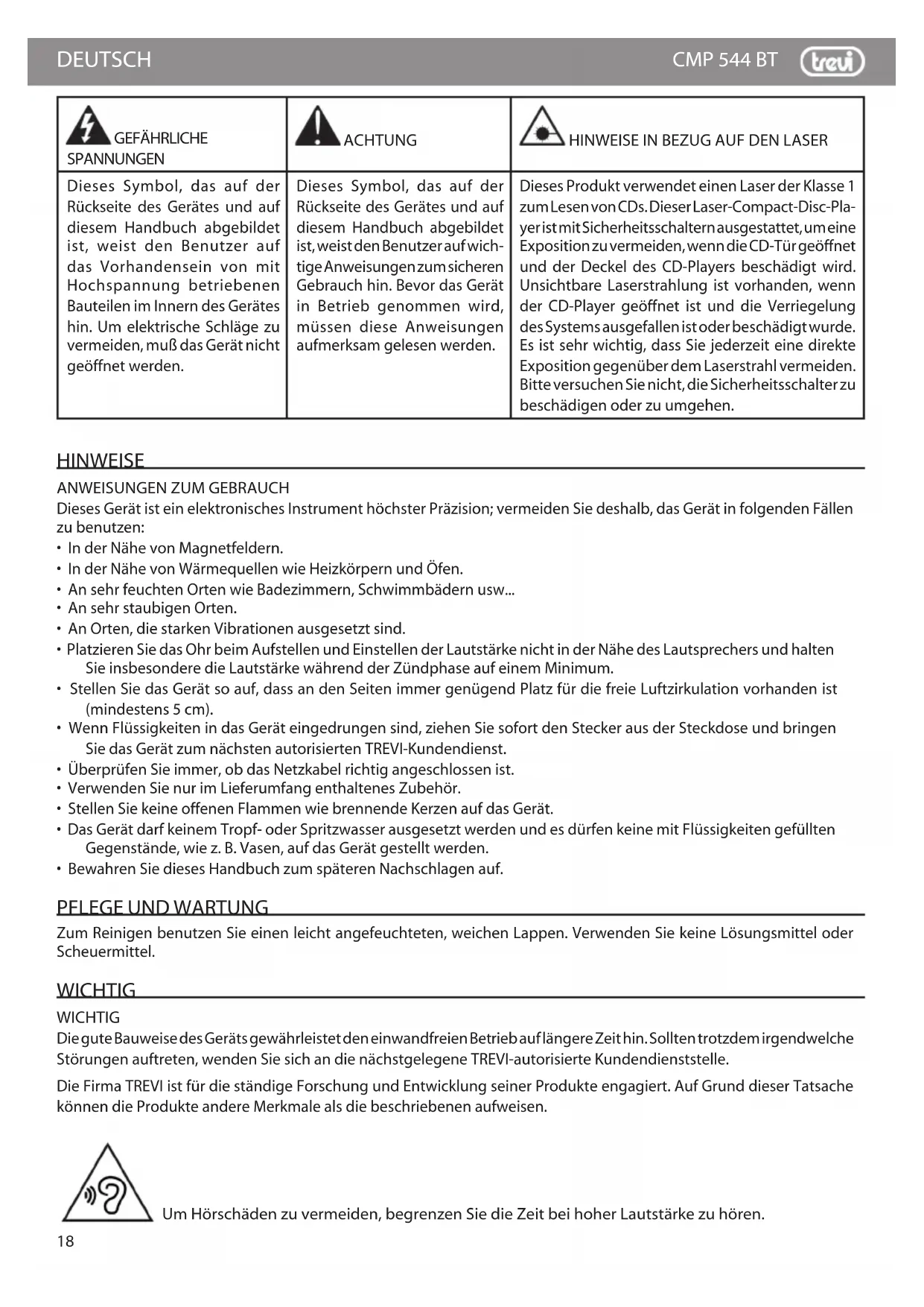 Dieses Symbol, das auf der Rückseite des Gerätes und auf diesem Handbuch abgebildet ist, weist den Benutzer auf das Vorhandensein von mit Hochspannung betriebenen Bauteilen im Innern des Gerätes hin. Um elektrische Schläge zu vermeiden, muß das Gerät nicht geöffnet werden. Dieses Symbol, das auf der Rückseite des Gerätes und auf diesem Handbuch abgebildet ist, weist den Benutzer auf wich- tige Anweisungen zum sicheren Gebrauch hin. Bevor das Gerät in Betrieb genommen wird, müssen diese Anweisungen aufmerksam gelesen werden. Dieses Produkt verwendet einen Laser der Klasse 1 zum Lesen von CDs. Dieser Laser-Compact-Disc-Pla- yer ist mit Sicherheitsschaltern ausgestattet, um eine Exposition zu vermeiden, wenn die CD-Tür geöffnet und der Deckel des CD-Players beschädigt wird. Unsichtbare Laserstrahlung ist vorhanden, wenn der CD-Player geöffnet ist und die Verriegelung des Systems ausgefallen ist oder beschädigt wurde. Es ist sehr wichtig, dass Sie jederzeit eine direkte Exposition gegenüber dem Laserstrahl vermeiden. Bitte versuchen Sie nicht, die Sicherheitsschalter zu beschädigen oder zu umgehen. DEUTSCH19 CMP 544 BT DEUTSCH