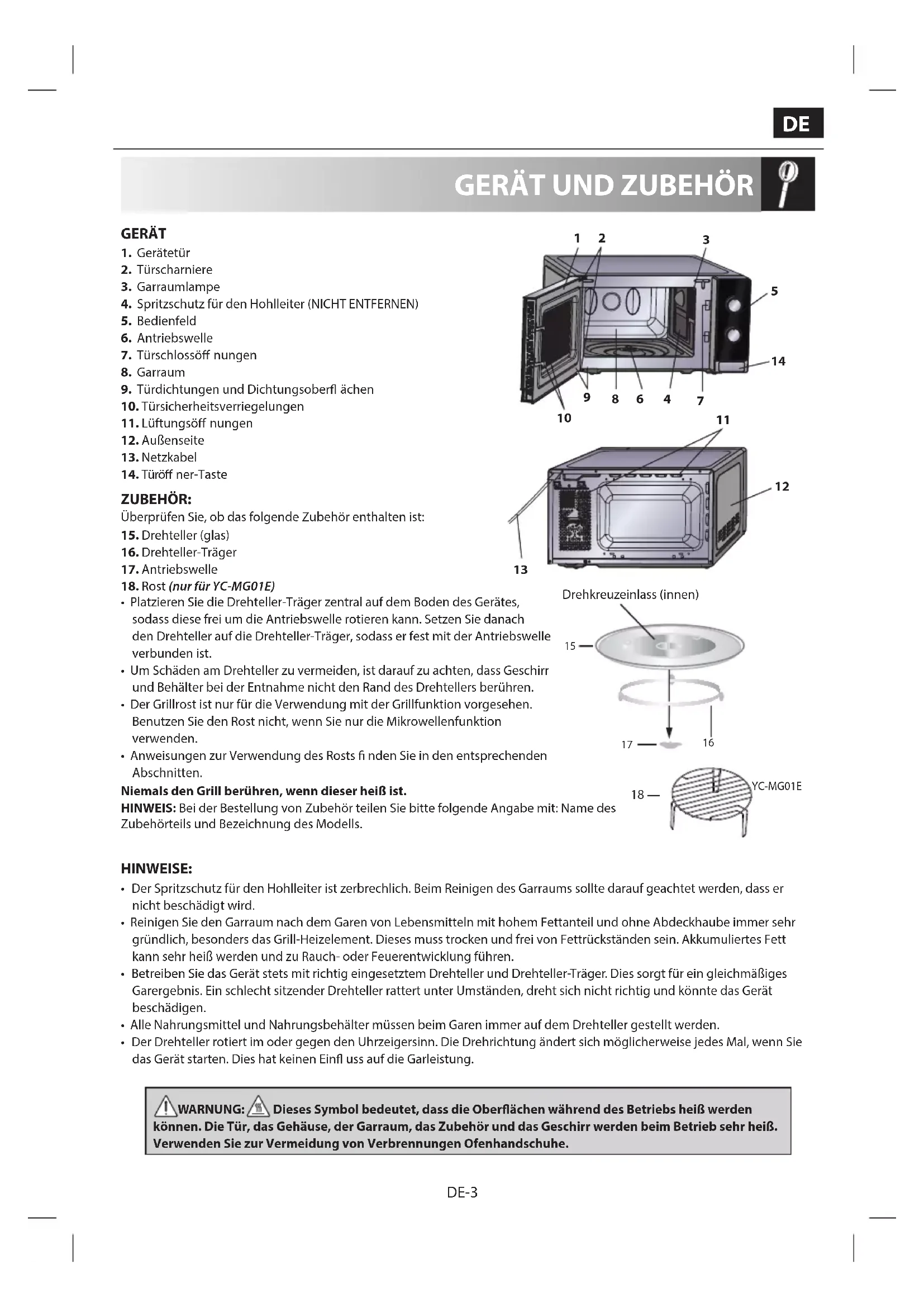 GERÄT 1. Gerätetür2. Türscharniere3. Garraumlampe4. Spritzschutz für den Hohlleiter (NICHT ENTFERNEN)5. Bedienfeld6. Antriebswelle7. Türschlossö nungen8. Garraum9. Türdichtungen und Dichtungsober ächen10. Türsicherheitsverriegelungen11. Lüftungsö nungen12. Außenseite13. Netzkabel14. Türö ner-Taste ZUBEHÖR: Überprüfen Sie, ob das folgende Zubehör enthalten ist:15. Drehteller (glas)16. Drehteller-Träger17. Antriebswelle18. Rost (nur für YC-MG01E)• Platzieren Sie die Drehteller-Träger zentral auf dem Boden des Gerätes, sodass diese frei um die Antriebswelle rotieren kann. Setzen Sie danach den Drehteller auf die Drehteller-Träger, sodass er fest mit der Antriebswelle verbunden ist.• Um Schäden am Drehteller zu vermeiden, ist darauf zu achten, dass Geschirr und Behälter bei der Entnahme nicht den Rand des Drehtellers berühren.• Der Grillrost ist nur für die Verwendung mit der Grillfunktion vorgesehen. Benutzen Sie den Rost nicht, wenn Sie nur die Mikrowellenfunktion verwenden.• Anweisungen zur Verwendung des Rosts nden Sie in den entsprechenden Abschnitten.Niemals den Grill berühren, wenn dieser heiß ist.HINWEIS: Bei der Bestellung von Zubehör teilen Sie bitte folgende Angabe mit: Name des Zubehörteils und Bezeichnung des Modells. HINWEISE: