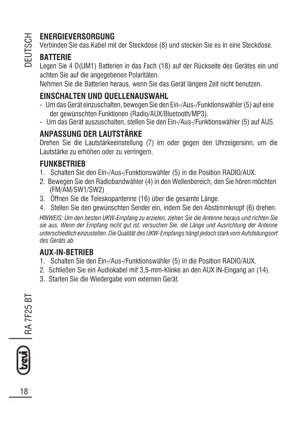 DEUTSCH 1. Lautsprecher2. Tuning-Anzeige3. BT/Signal Stärkeanzeige4. Radioband-Wahlschalter5. Ein- / Ausschalten / Funktionswähler6. Tuning-Regler7. Lautstärkeregelung8. 230V 50Hz Netzsteckdose9. PREV-Taste, vorheriger Titel10. PLAY/PAUSE-Taste, aktiviert / pausiert die Wiedergabe eines Titels11. NEXT-Taste, nächster Titel12. microSD-Speichereingang13. USB-Speichereingang14. AUX IN-Eingang15. Kopfhörereingang16. Antenne17. Griff18. BatteriefachQUICKINFO