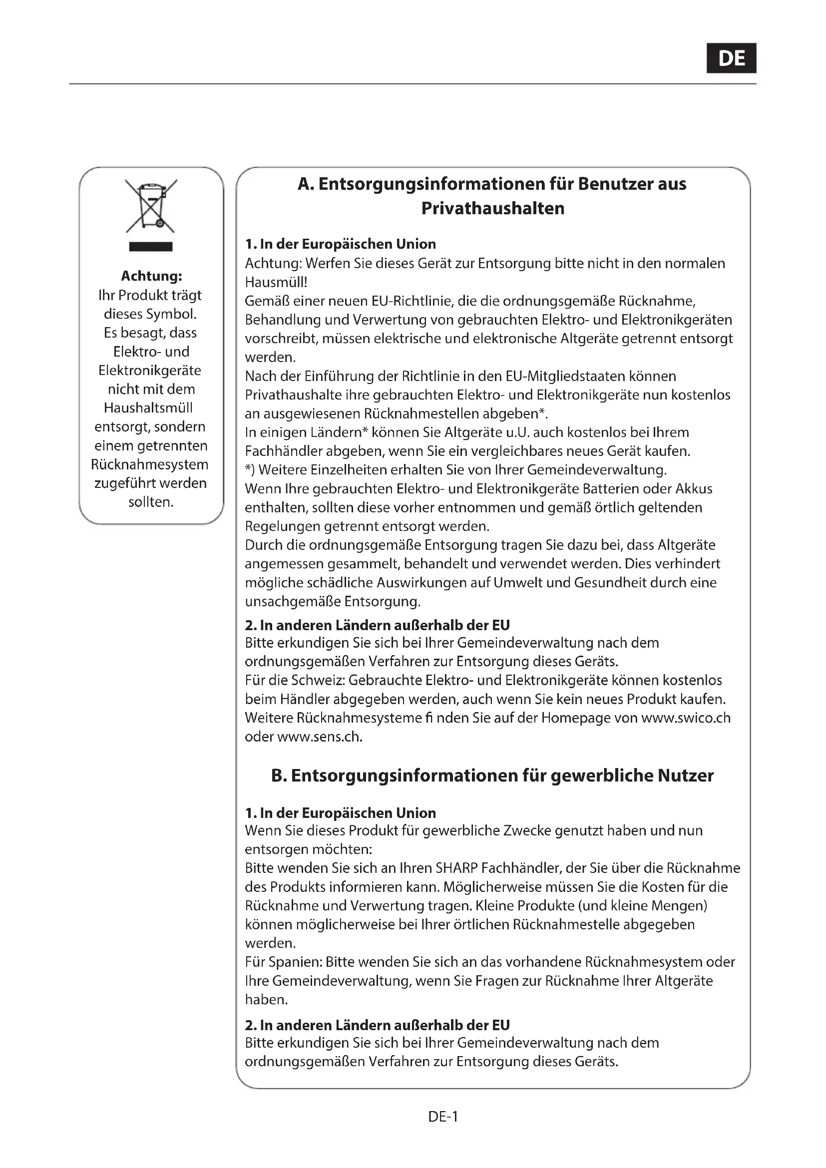 Wenn Sie dieses Produkt für gewerbliche Zwecke genutzt haben und nun entsorgen möchten: Bitte wenden Sie sich an Ihren SHARP Fachhändler, der Sie über die Rücknahme des Produkts informieren kann. Möglicherweise müssen Sie die Kosten für die Rücknahme und Verwertung tragen. Kleine Produkte (und kleine Mengen) können möglicherweise bei Ihrer örtlichen Rücknahmestelle abgegeben werden. Für Spanien: Bitte wenden Sie sich an das vorhandene Rücknahmesystem oder Ihre Gemeindeverwaltung, wenn Sie Fragen zur Rücknahme Ihrer Altgeräte haben.
