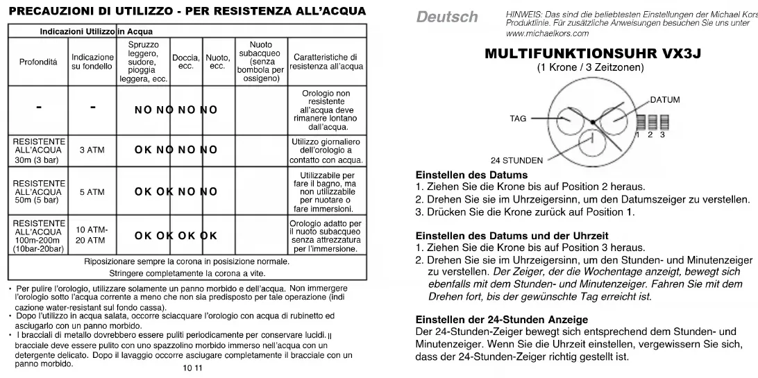 Geeignet zum Baden, kann aber nicht beim Schwimmen odor Tauchen getragen werden.Wasser-geschützt100m-200m(10 bar-20 bar)10 ATM-20 ATM JA JA JA JA Verträgt Schnorcheln.Wichtig: Die Krone immer in die normale Position stellen und unter Wasser nicht herausziehen. Verschlußschraubenkronen vollständig anziehen.• Reinigen Sie Ihre Uhr nur mit einem weichen Tuch und Wasser. Tauchen Sie Ihre Uhr nicht ins Wasser, es sei denn, sie ist wasserdicht (siehe Gehäuseboden).• Uhrengehäuse und Armband, nachdem sie mit Salzwasser in Berührung waren, unter dem Wasserkran abspülen und mit einem weichen Tuch abtrocknen.• Metallarmbänder sollten regelmäßig gereinigt werden, damit sie immer gut aussehen. Verwenden Sie eine weiche Bürste und eine milde Seifenlösung. Danach mit einem weichen Tuch gründlich abtrocknen. Français MUlTIfONCTIONS VX3J (1 couronne / 3 compteurs) Réglage de la Date